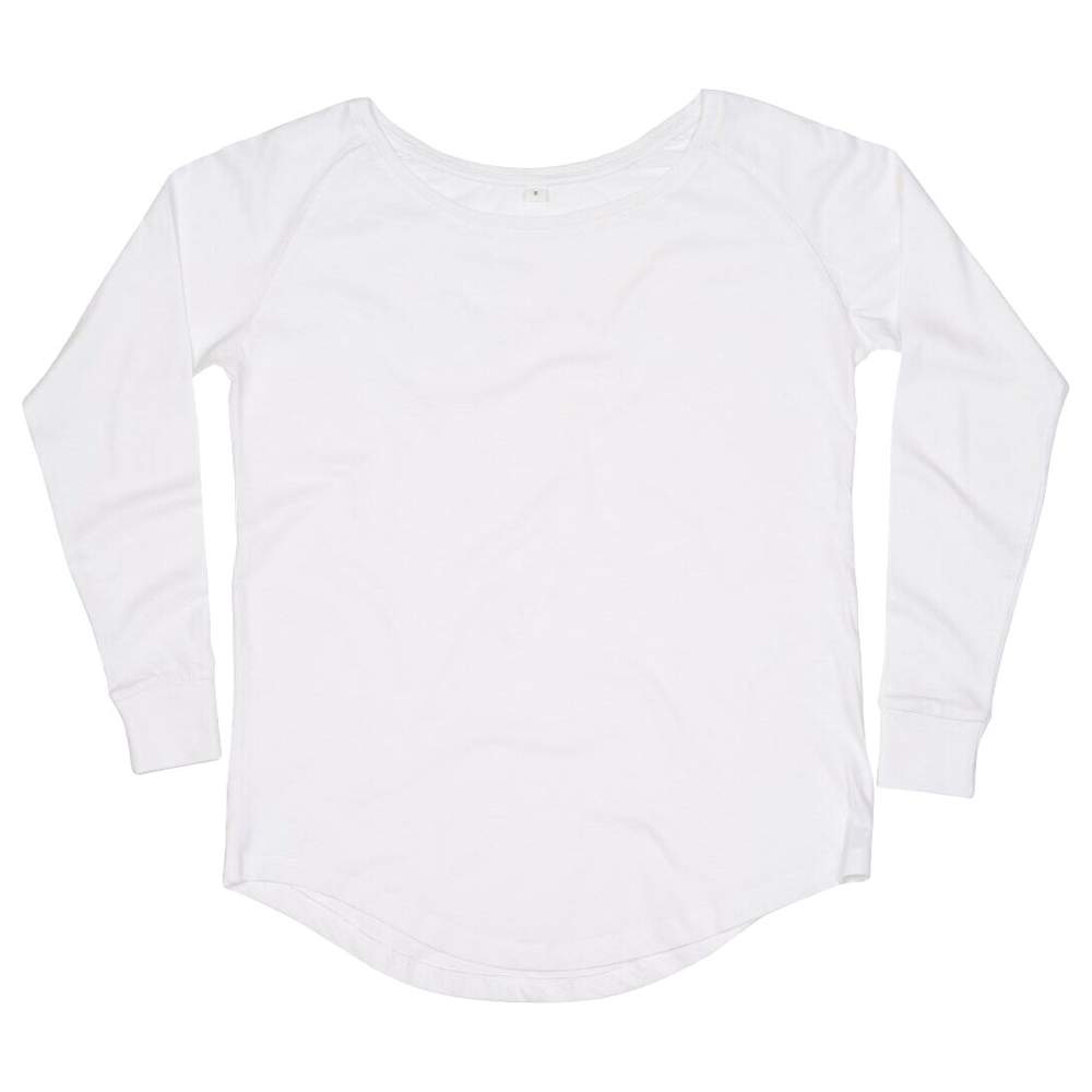 Maglietta unicolore per donna, a maniche lunghe, in coton bio o in conversione, ringspun e pettinato. Jersey semplice. Scollatura larga. Taglio moderno. Maniche raglan con bordo a coste 1x0. Orlo arrotondato con parte posteriore leggermente più lunga. Etichetta della taglia strappabile.