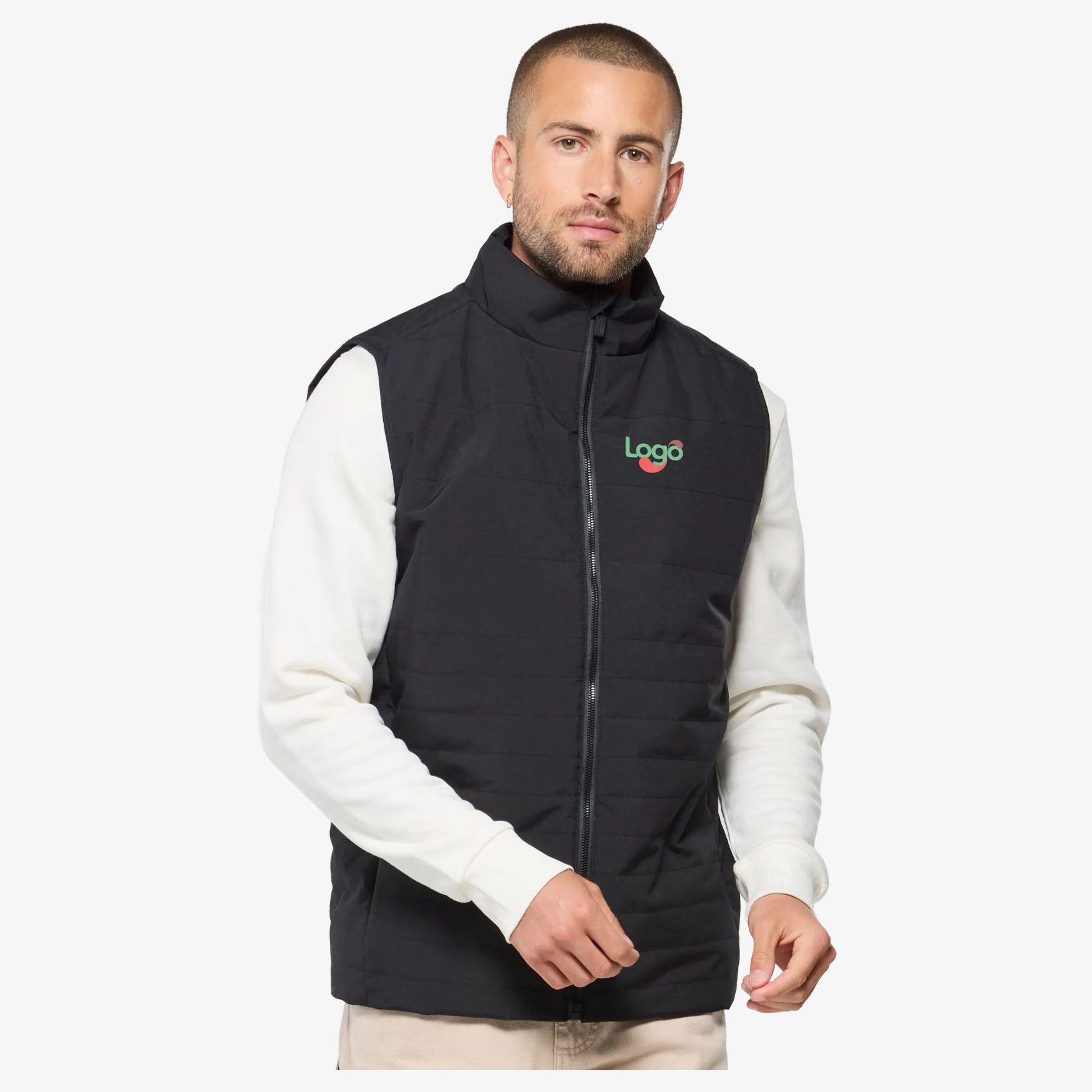 Il bodywarmer trapuntato è realizzato in poliestere con imbottitura 100% poliestere riciclato. Include due tasche esterne con zip nascoste e una tasca interna con zip. Il modello consente l'accesso per la personalizzazione.
