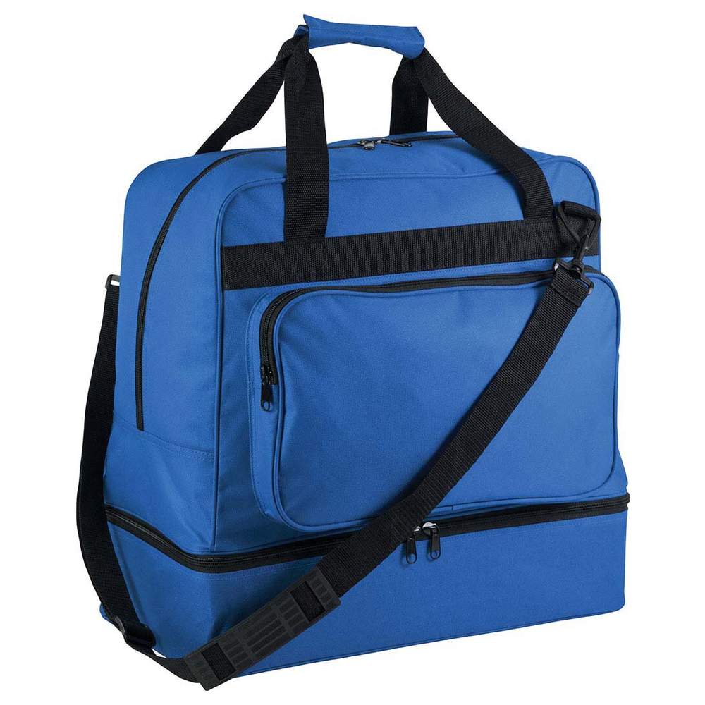 Borsa da palestra con una capacità di 60 litri, realizzata in poliestere 600D per una buona resistenza. È dotata di una base rigida staccabile in polipropilene, che garantisce una maggiore stabilità e protegge il contenuto. La base rigida è dotata di piedi in plastica per evitare il contatto diretto con il terreno. Una tasca con cerniera sul davanti permette un accesso facile agli effetti personali e offre la possibilità di personalizzare la borsa. Una cinghia per la spalla staccabile con cuscinetto in silicone garantisce un trasporto confortevole. La base rigida è inclusa con la borsa.
