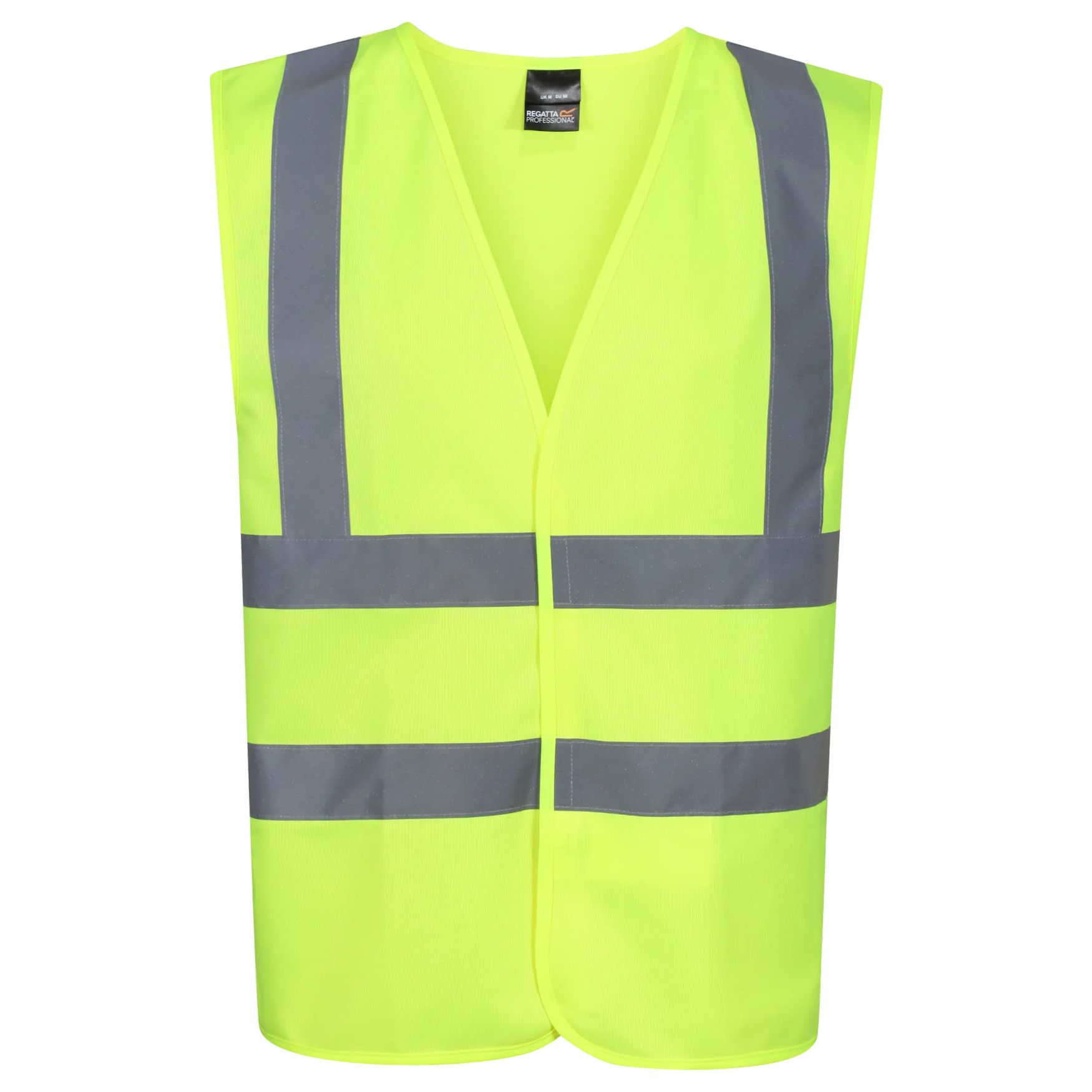Il Men s hi vis vest è un gilet di sicurezza con taglia regolabile tramite fascia a strappo. Include due bande verticali e due bande orizzontali riflettenti cucite per uso di segnalazione.