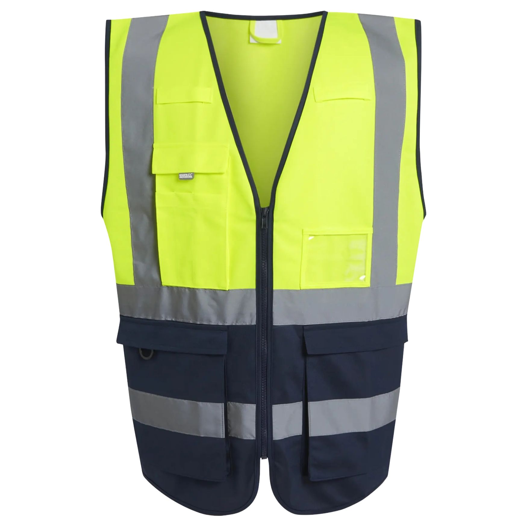 Il Pro hi vis vest è un gilet di sicurezza multitasche con chiusura zip, bande riflettenti cucite, tasca per telefono, portabadge identificativo e passanti per radio. La sua configurazione facilita l'organizzazione degli accessori utili in ambito professionale.