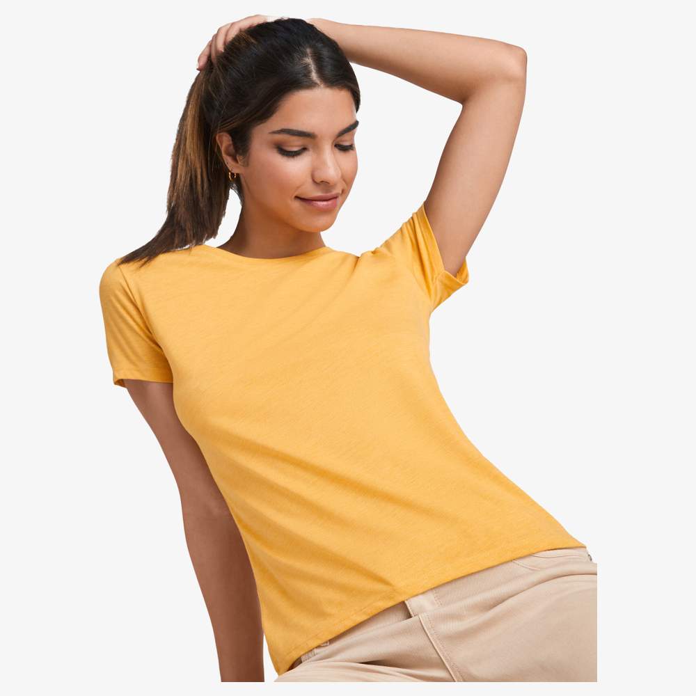 T-shirt maniche corte per donna in tessuto chiné. Collo rotondo in costa 1x1 con banda di pulizia rinforzata all'interno. Etichetta staccabile. Duo concept.