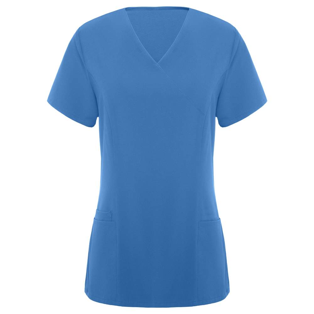 Camicia con maniche corte per donna. Collo a V incrociato. Due tasche francesi. Etichetta staccabile. Composizione: 94% poliestere, 6% elastan. Camicia da abbinare ai pantaloni FIBER.