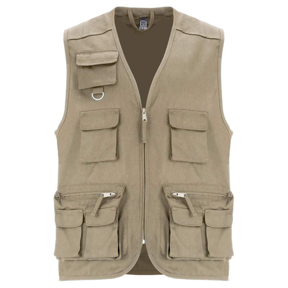 Gilet da lavoro multi-tasca collo a V. Zip centrale con tirante. Tre tasche toraciche con lembo e chiusura mediante nastro autoagrippante. Tasca superiore lato destro con anello multifunzione. Due tasche laterali con zip e tirante, con due tasche sovrapposte con lembo e chiusura mediante nastro autoagrippante. Due tasche posteriori con lembo e chiusura mediante nastro autoagrippante. Collo, maniche e orlo con passamano. Etichetta staccabile. Composizione: 80% poliestere, 20% cotone.