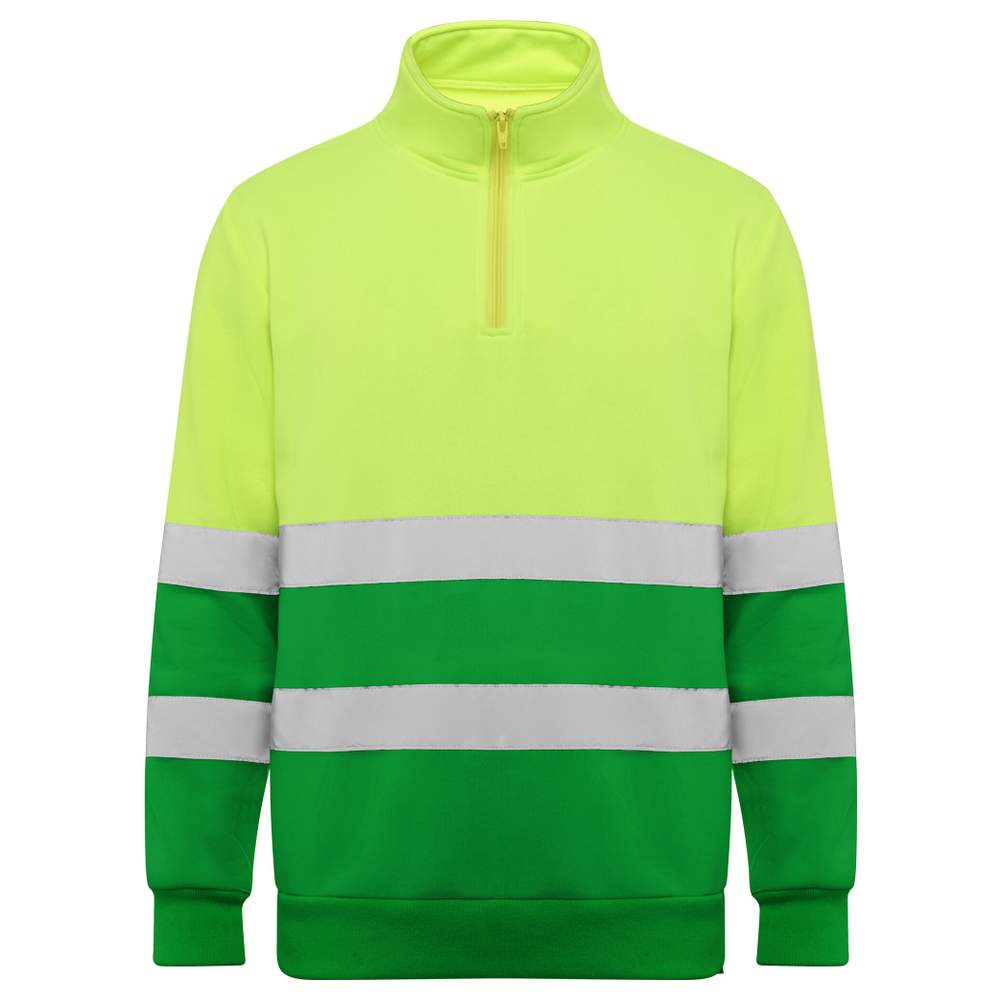 Felpa alta visibilità con cerniera, progettata per una visibilità migliorata in condizioni di scarsa illuminazione. È dotata di un colletto alto con protezione per il mento e una cerniera per un comfort ottimale. Due bande riflettenti orizzontali sono presenti sul torace e sulle maniche, migliorando la visibilità. Una banda di pulizia rinforzata all'interno del collo contribuisce alla durabilità dell'abbigliamento. L'etichetta è staccabile per un maggiore comfort. Questa felpa è certificata CE secondo le normative EN ISO 13688:2013/A1:2021 e EN ISO 20471:2013/A1:2017, classe II.