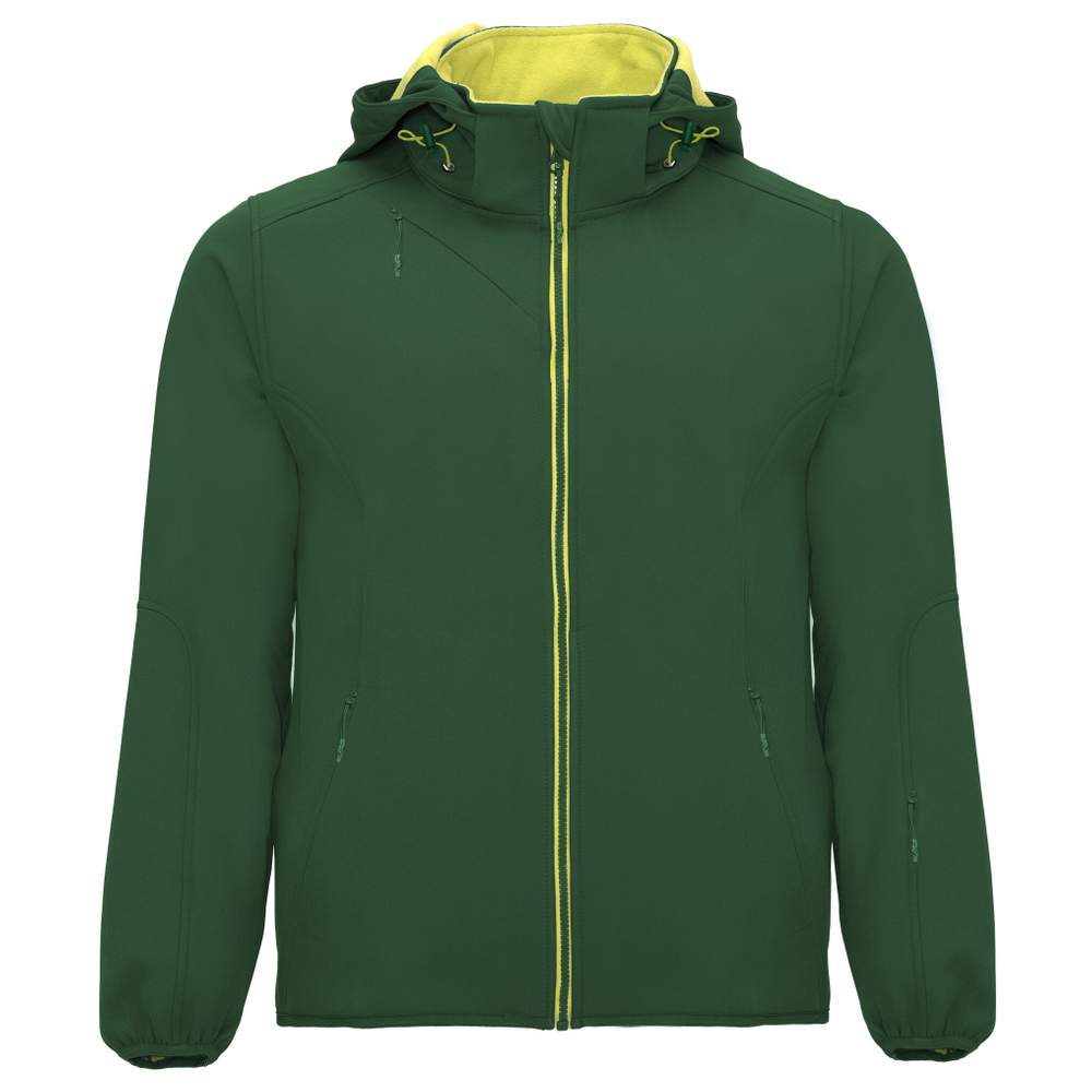 Abbigliamento softshell a 2 strati per lo sport. Cerniera centrale iniettata contrastante con protezione mento e cursore. Interno caldo in tessuto micropolare contrastante. Due tasche laterali e una sul petto con cerniera invisibile e cursore. Piccola tasca sulla manica sinistra. Liseré elastico ai polsini e sull'orlo inferiore. Cappuccio rimovibile con fodera in micropolare contrastata. Etichetta staccabile. Resistente all'acqua e al vento.