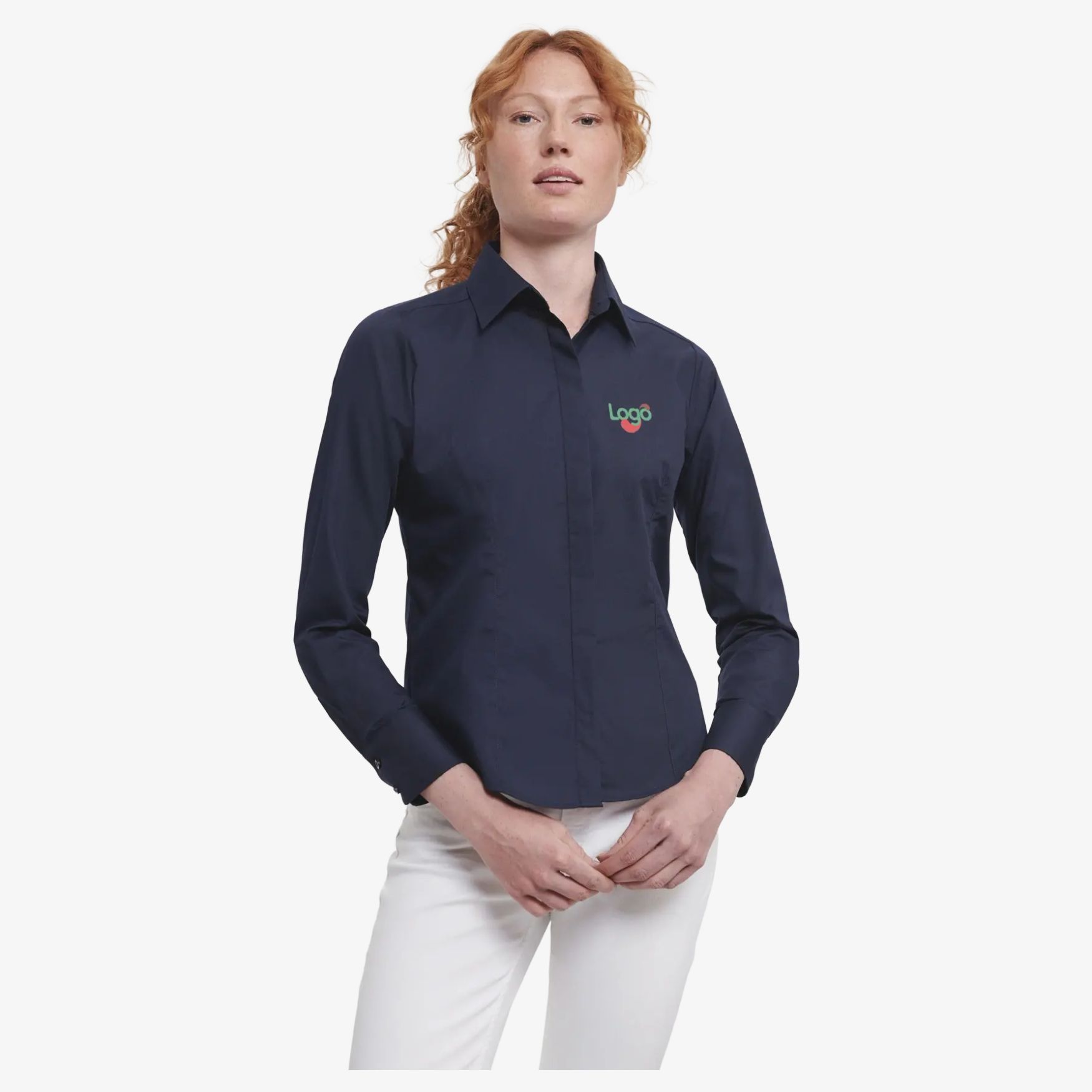 La camicia popeline poliestere-cotone da donna presenta una vestibilit\u00e0 sagomata con maniche lunghe e patta di chiusura invisibile. Include un inserto posteriore e polsini arrotondati con due bottoni. Pince sulla schiena e sul busto garantiscono una vestibilit\u00e0 aderente. Orlo arrotondato e bottoni riserva completano il design. Composizione 65% poliestere, 35% cotone popeline.