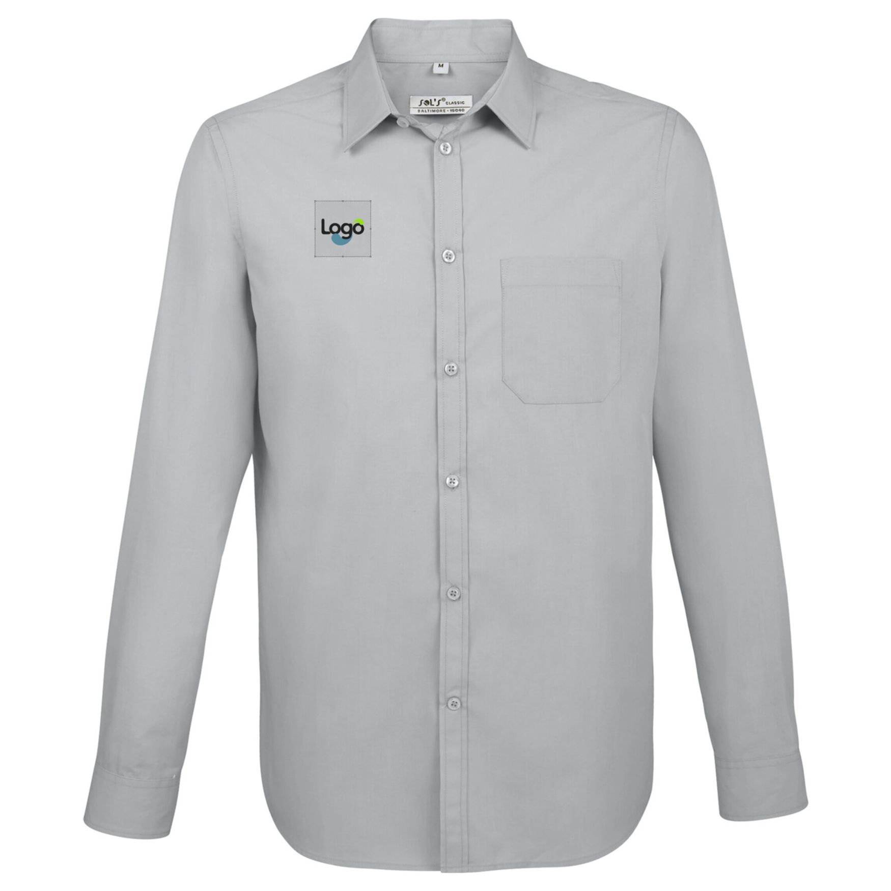 Camicia uomo popeline maniche lunghe SOL'S Baltimore fit. Realizzata in popeline di poliestere cotone 65% poliestere - 35% cotone, con un colletto classico rinforzato, balene rimovibili, una tasca sul lato sinistro del petto, un risvolto a 7 bottoni dello stesso colore e polsini a due bottoni regolabili con patta capuccina. Questo modello è ideale per una personalizzazione in ricamo o stampa del tuo logo.