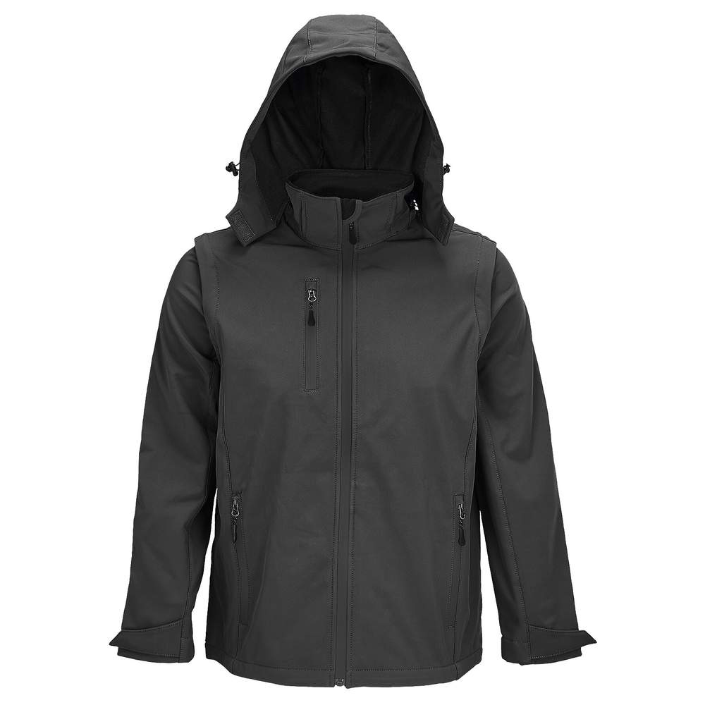 Abbigliamento Softshell 3 in 1 con cappuccio e maniche rimovibili. Apertura principale, tasche laterali e pettorali con zip nylon ton sur ton. Corda metallica riflettente ton sur ton con cordoncino riflettente. Cappuccio e fondo elastici regolabili con estremità di serraggio. Polsini regolabili con fascia autoagrippante. Tasca interna con zip in nylon. Composizione: Esterno: 94% poliestere riciclato, 6% elastan. Faccia interna: microfibra 100% poliestere riciclato. 3 strati. Membrana impermeabile e traspirante.