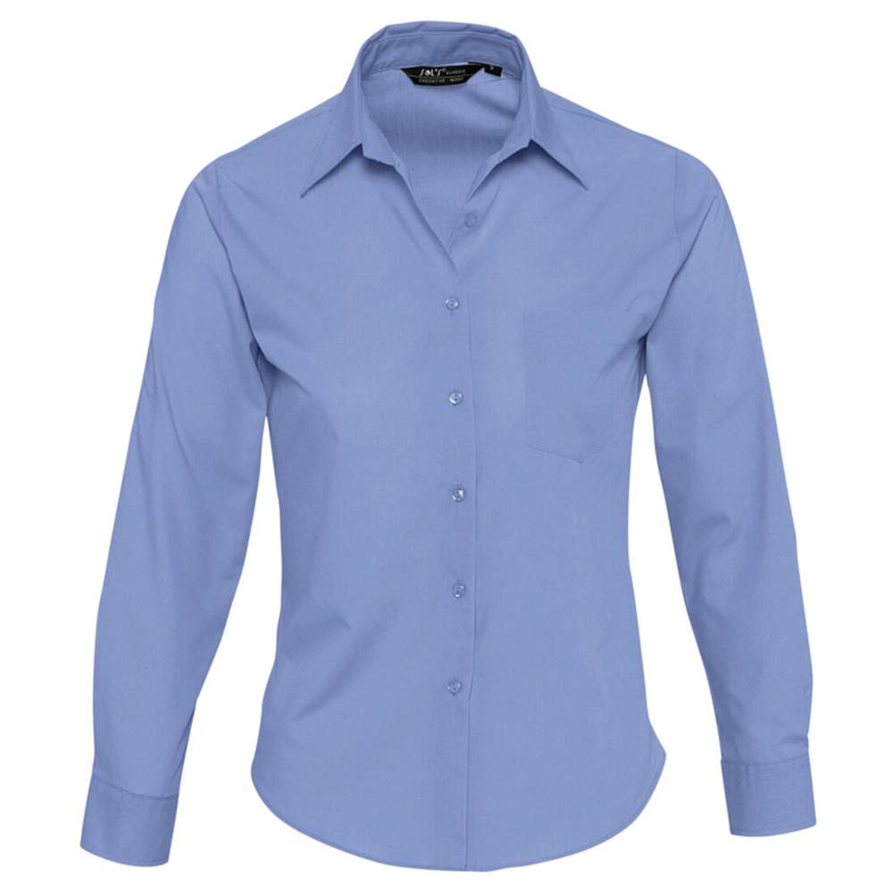 CAMICIA DONNA POPELINE MANICHE LUNGHE SOL'S Executive. Taglio classico, colletto rinforzato, tasca lato cuore, patta 7 bottoni tinta su tinta, polsini 2 bottoni regolabili e patta cappuccino. Tessuto: 65% poliestere 35% cotone.