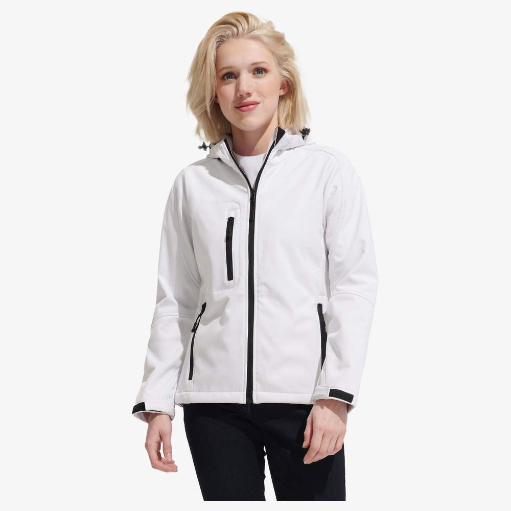 Abbigliamento softshell cappuccio per donna, progettato per offrire comfort e protezione. L'esterno in poliestere ed elastan garantisce una certa flessibilità e resistenza, mentre la membrana TPU assicura l'impermeabilità e la traspirabilità. Questo abbigliamento è dotato di due tasche laterali e una tasca sul petto, tutte con zip, per un ripostiglio sicuro. Un cordoncino di serraggio regolabile in vita e i polsini regolabili permettono di adattare l'abbigliamento alle proprie esigenze. Il cappuccio, anch'esso dotato di un cordoncino di serraggio, offre una protezione aggiuntiva.