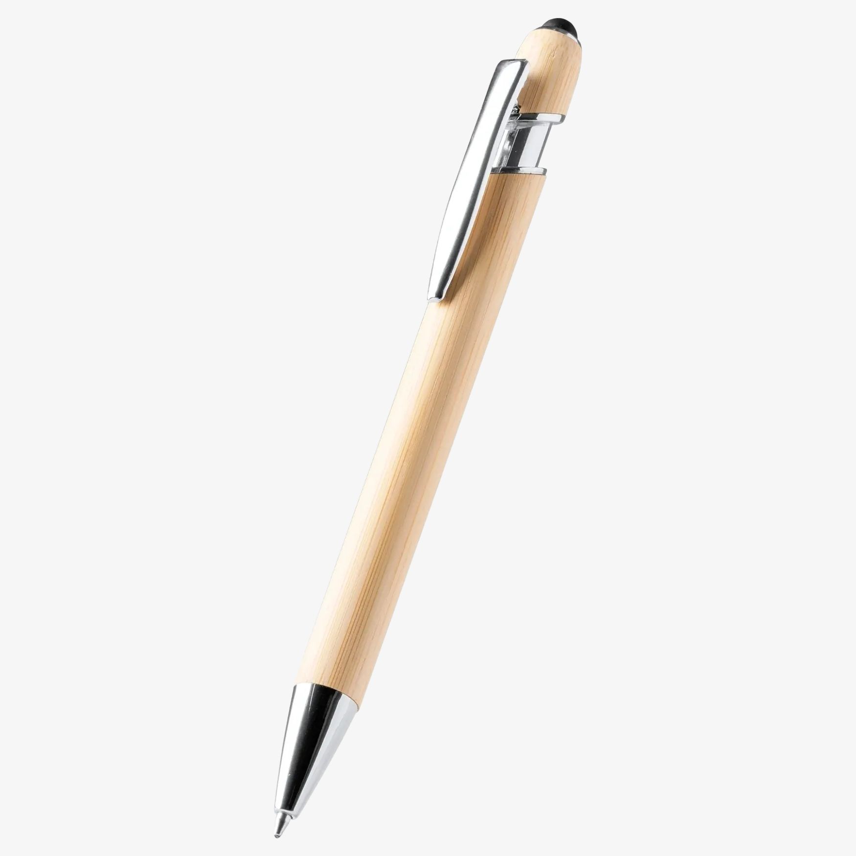 La penna Varel consente la scrittura quotidiana e l'uso su schermo touch grazie al puntatore integrato. Fusto in bambù, meccanismo a pulsante e finiture metalliche. Inchiostro blu.