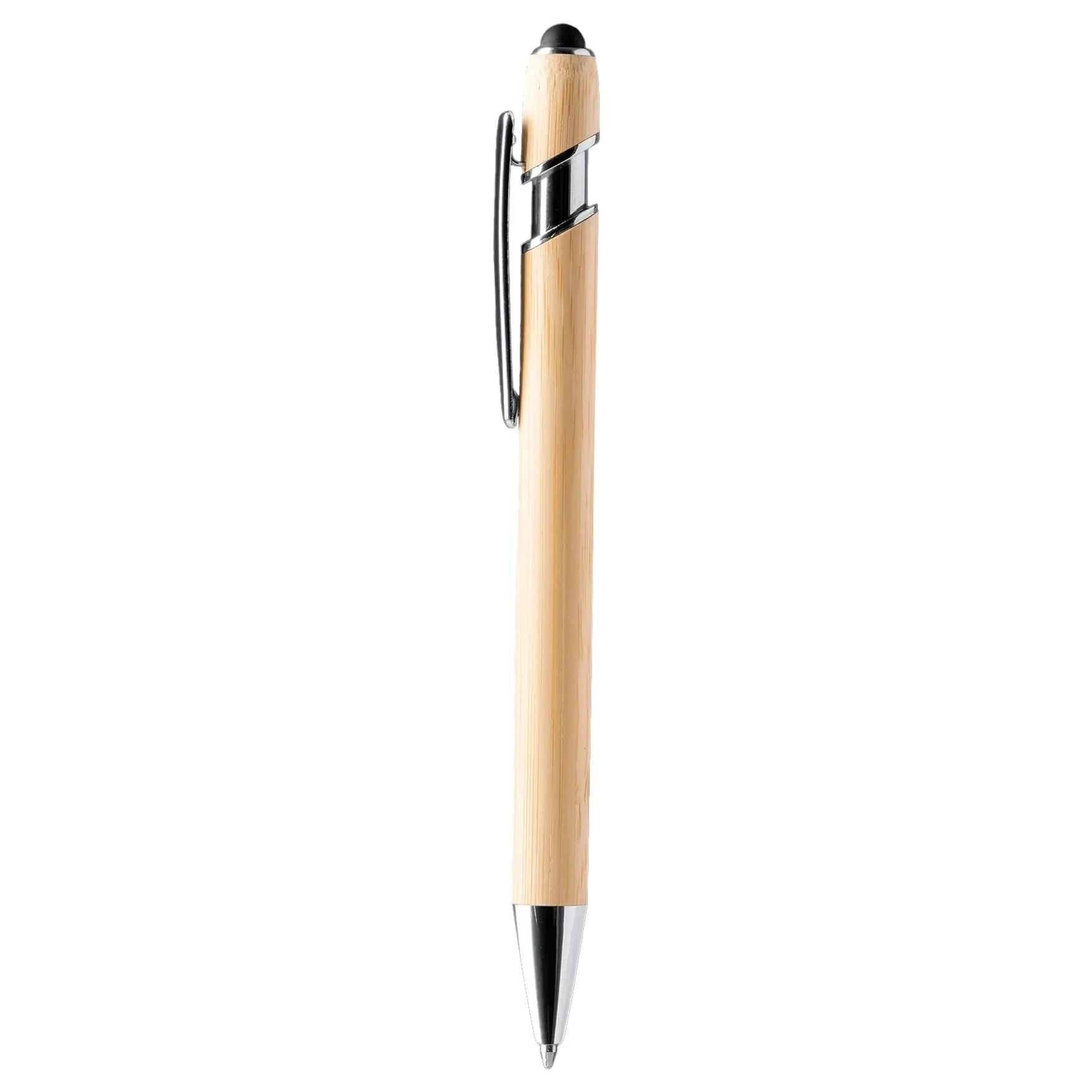 La penna Varel consente la scrittura quotidiana e l'uso su schermo touch grazie al puntatore integrato. Fusto in bambù, meccanismo a pulsante e finiture metalliche. Inchiostro blu.