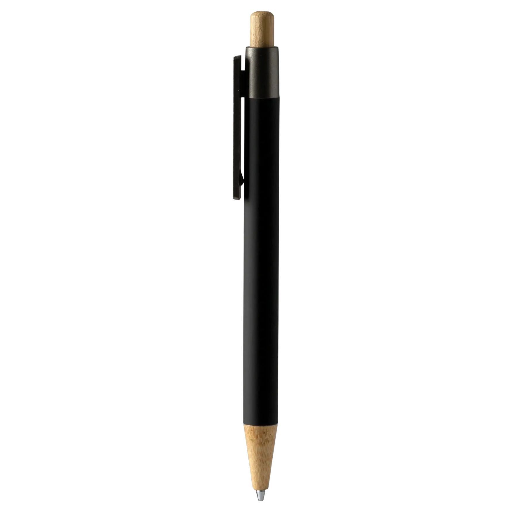 La penna Copla a inchiostro blu con corpo metallico finitura gommata, pulsante a scatto in bambù e clip ampia piatta in bambù, adatta alla scrittura quotidiana in ufficio o in movimento.