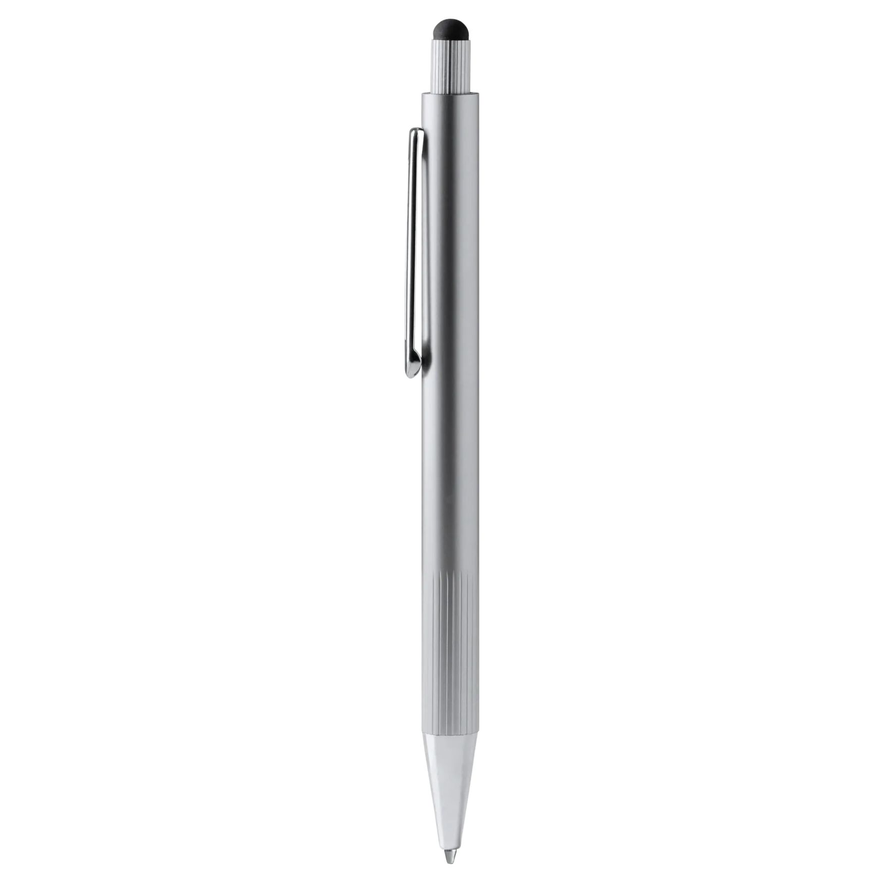 La penna a sfera Garet in alluminio con impugnatura rigata e finitura metallica include un pulsante a pressione touch e una ricarica d’inchiostro jumbo blu per una presa stabile e una scrittura uniforme.