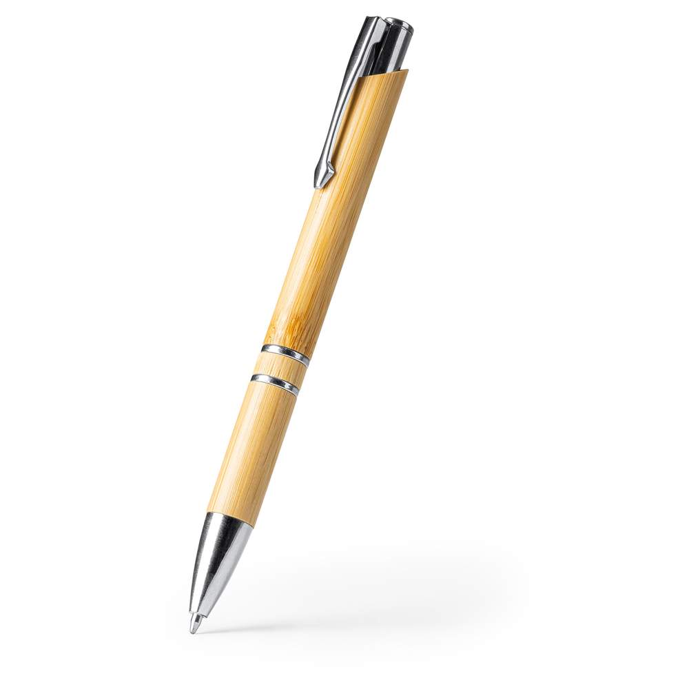 Penna a sfera con corpo in bambù e pulsante in finitura metallo. Ricarica gigante d'inchiostro blu. Dimensioni: lunghezza 14cm, diametro 1,1cm. Composizione: bambù, metallo.