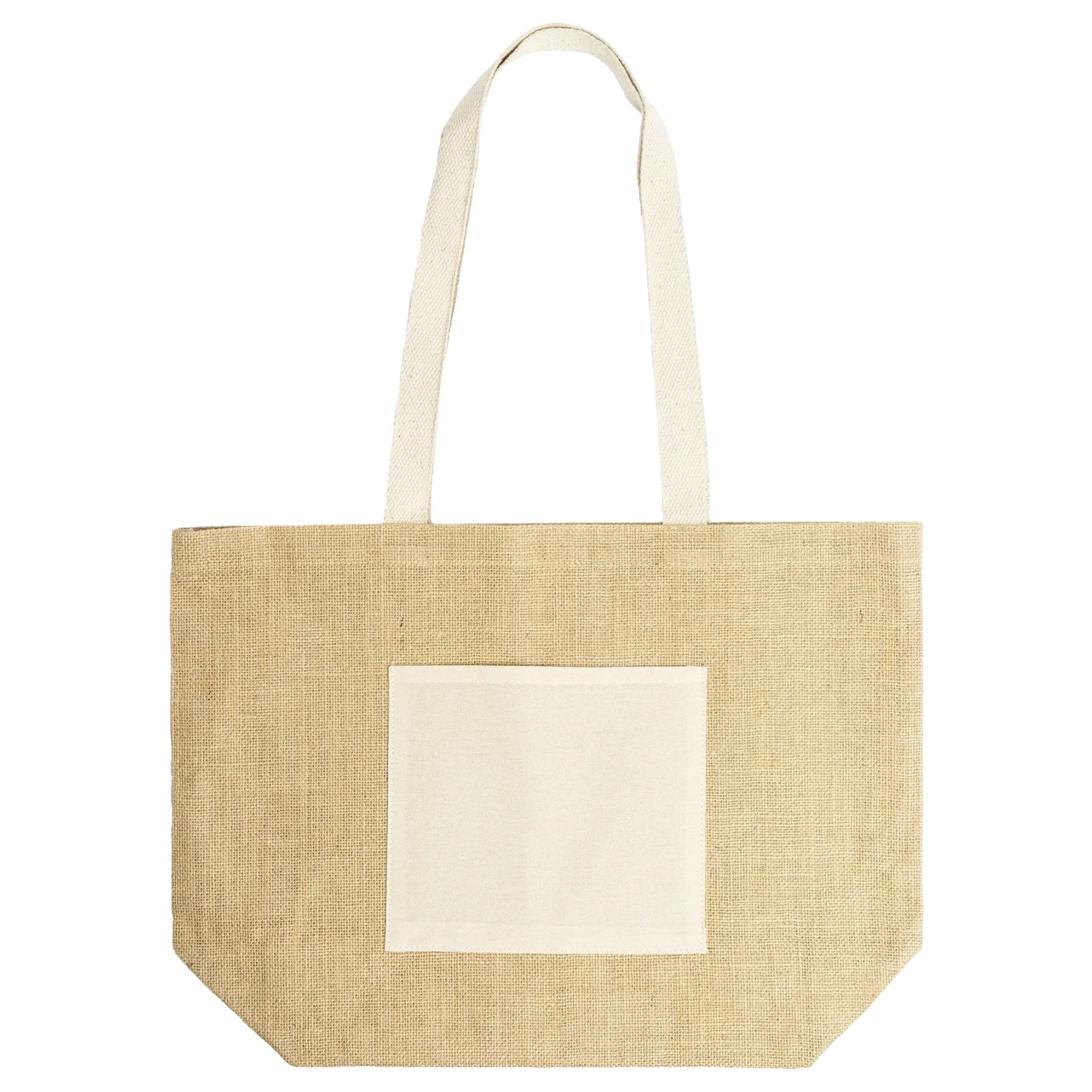 La borsa shopper Gavia in iuta laminata con tasca frontale e manici lunghi in cotone naturale, adatta al trasporto quotidiano di effetti personali. Dimensioni 48 x 15 x 35 cm.