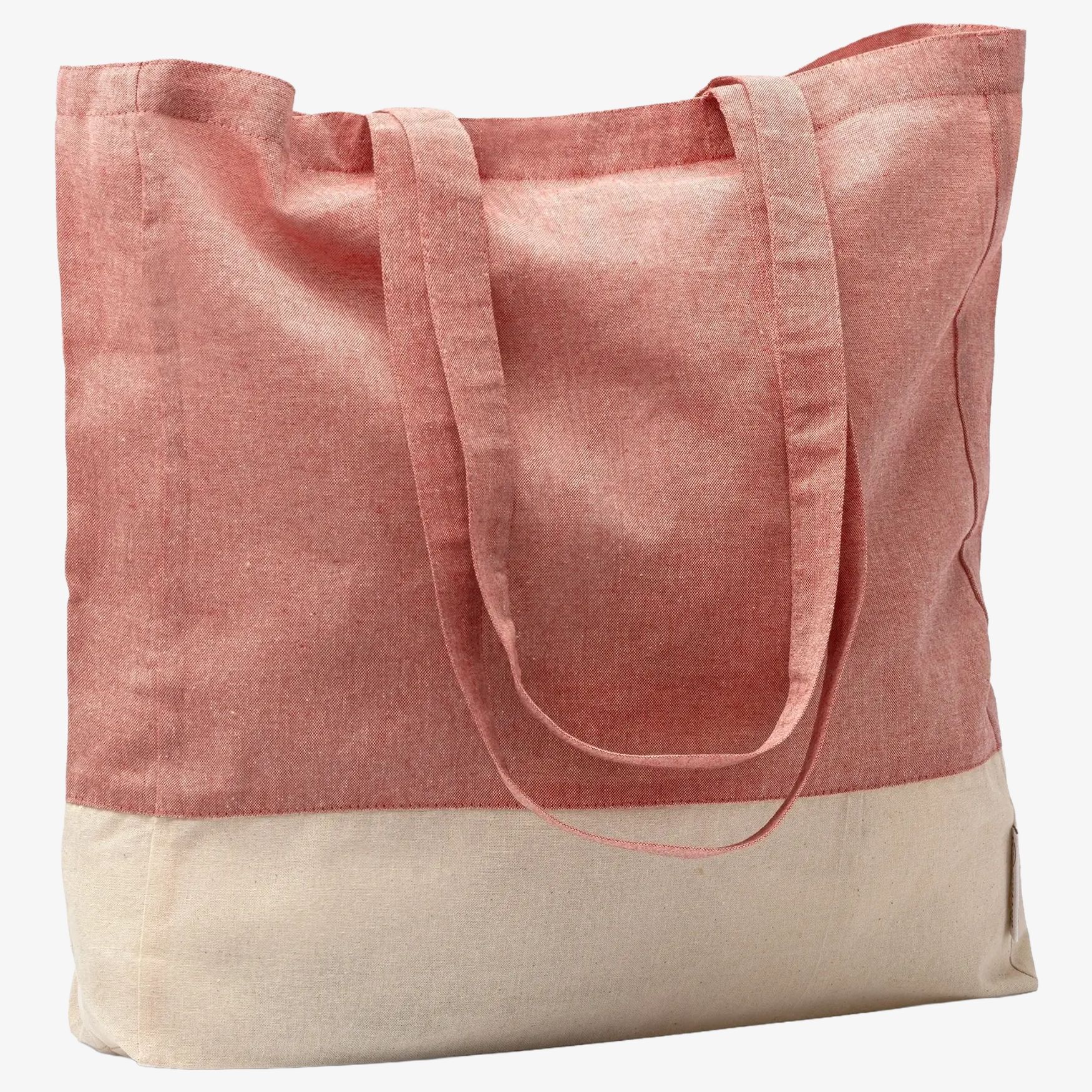 La borsa shopping INCA in cotone riciclato con design mélange, con soffietto, è adatta al trasporto di oggetti quotidiani. Manici rinforzati da 70 cm per il trasporto a mano o a spalla.