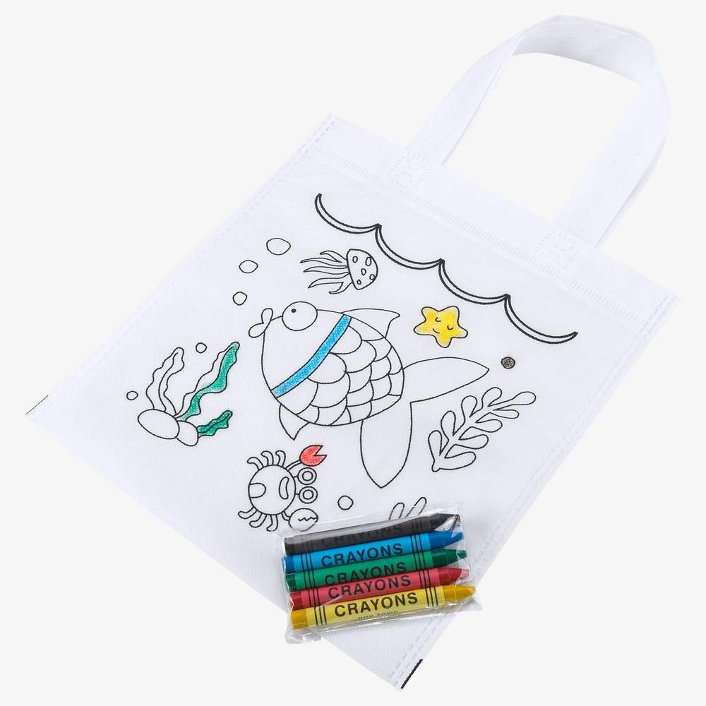 Sac non tessuto per bambini progettato per essere colorato, offrendo un'attività creativa divertente. È fornito di un set di 5 pastelli dalle tonalità varie, permettendo ai bambini di personalizzare il loro sacchetto. Questo sac è ideale per trasportare piccoli oggetti, la spesa leggera o come accessorio per le attività scolastiche e di tempo libero. Le sue dimensioni pratiche di 20,5 x 22 cm ne fanno un sacchetto compatto e facile da trasportare. La sua composizione in non-tessuto garantisce una certa resistenza e durabilità.
