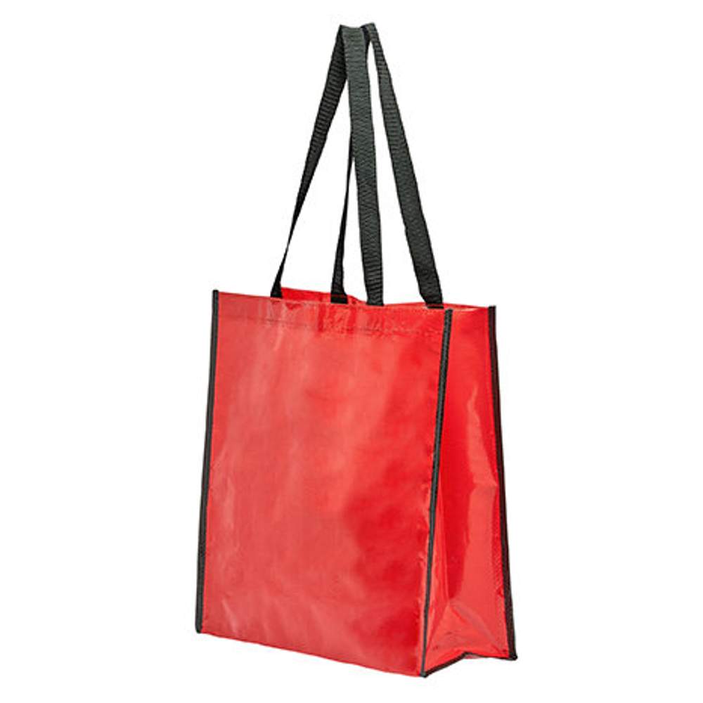 Borsa laminata lucida senza chiusura. Dotata di manici in nylon con cuciture a X e bordino nero. Le dimensioni sono 39 x 15 x 39 cm. Questa borsa è realizzata in polipropilene laminato.
