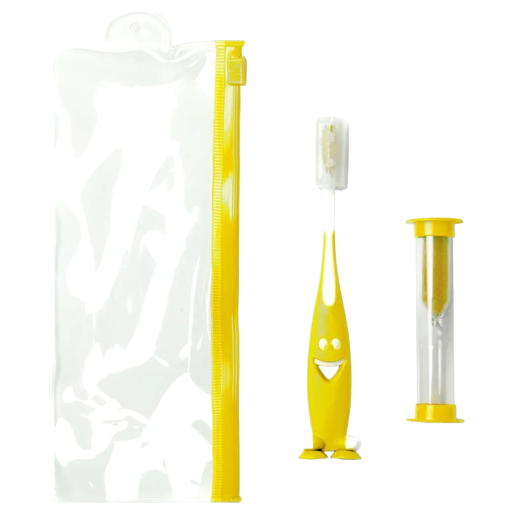 Il set Mesler spazzolino da denti e clessidra comprende uno spazzolino da denti a finitura liscia con base a ventosa e una clessidra da 2 minuti come riferimento di durata.