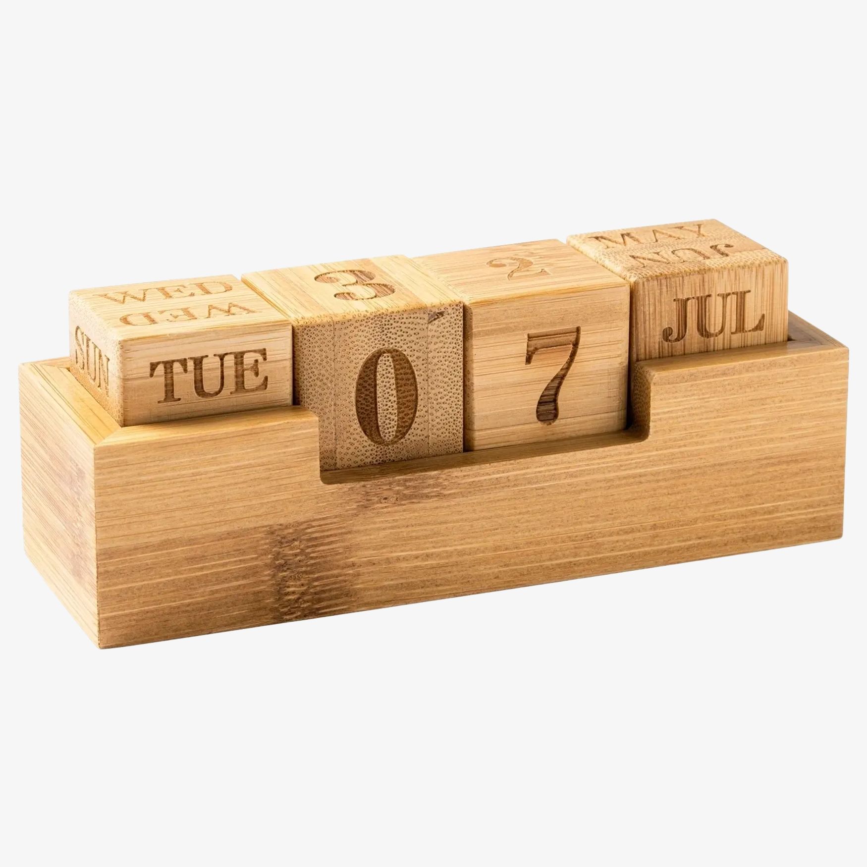 Il calendario perpetuo da tavolo in bambù MEDUS è composto da un supporto e quattro blocchi incisi per visualizzare la data quotidianamente su una scrivania.