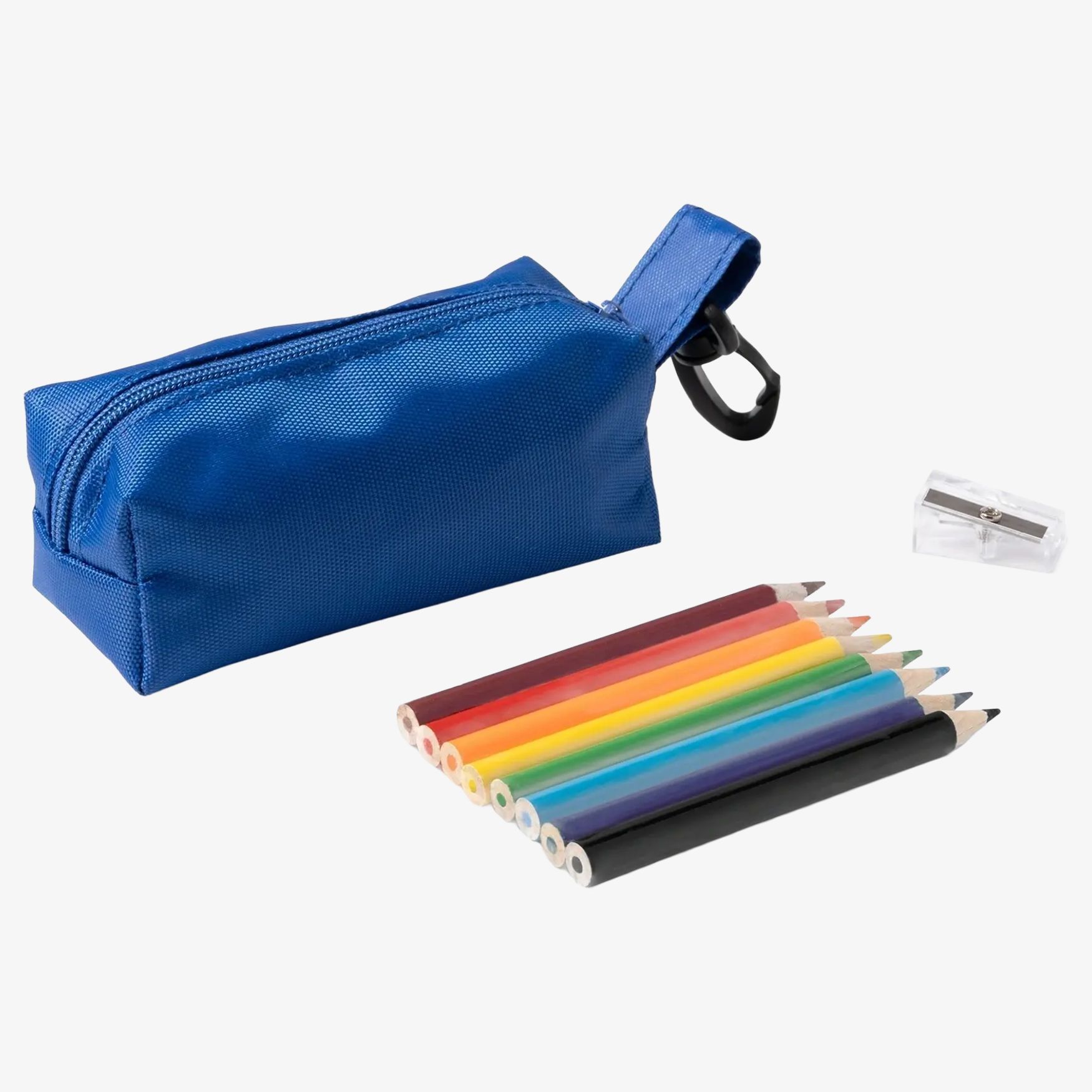 Minto è un astuccio pochette in RPET con chiusura a zip e moschettone girevole, adatto al trasporto di matite. Set con 8 matite colorate e un temperamatite. Dimensioni 10 x 4,5 x 4 cm.