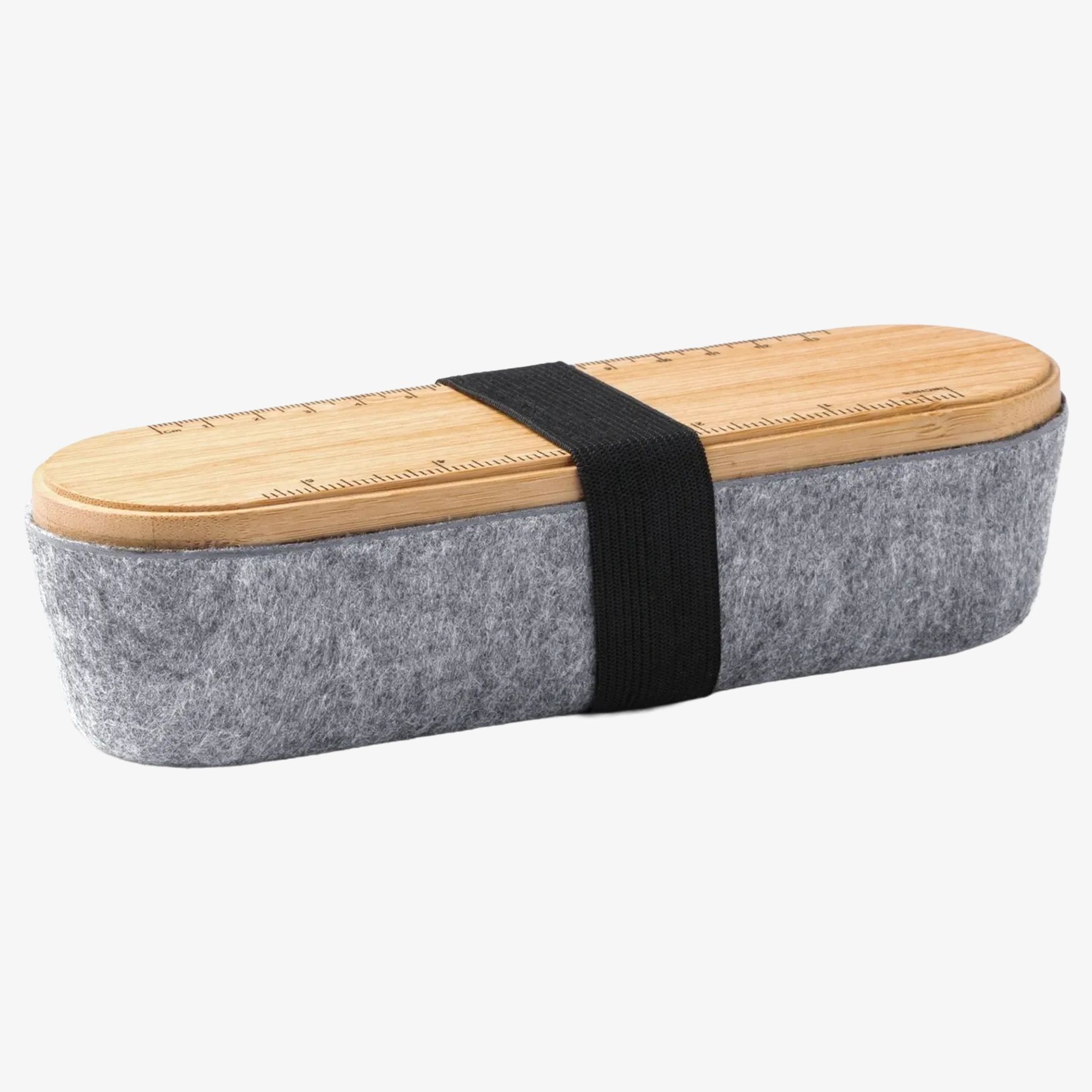 Il portapenne Nibix st-et1325 organizza le penne su una scrivania. Il coperchio in bambù integra un righello e un supporto per smartphone. La struttura principale è in feltro riciclato.