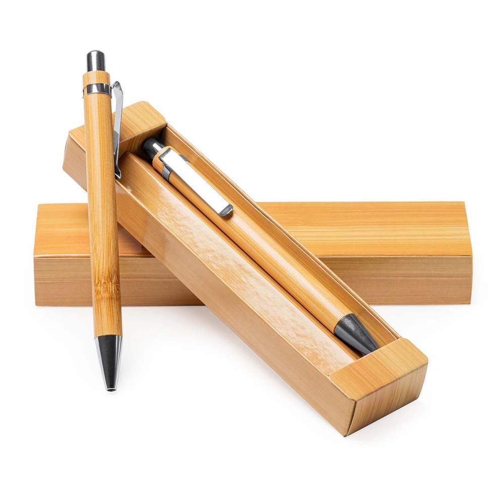 Set di stilo a sfera e porta mine in bambù. Meccanismo a pulsante. Inchiostro blu. Composizione: penna a sfera e matita meccanica in bambù, scatola in cartone.