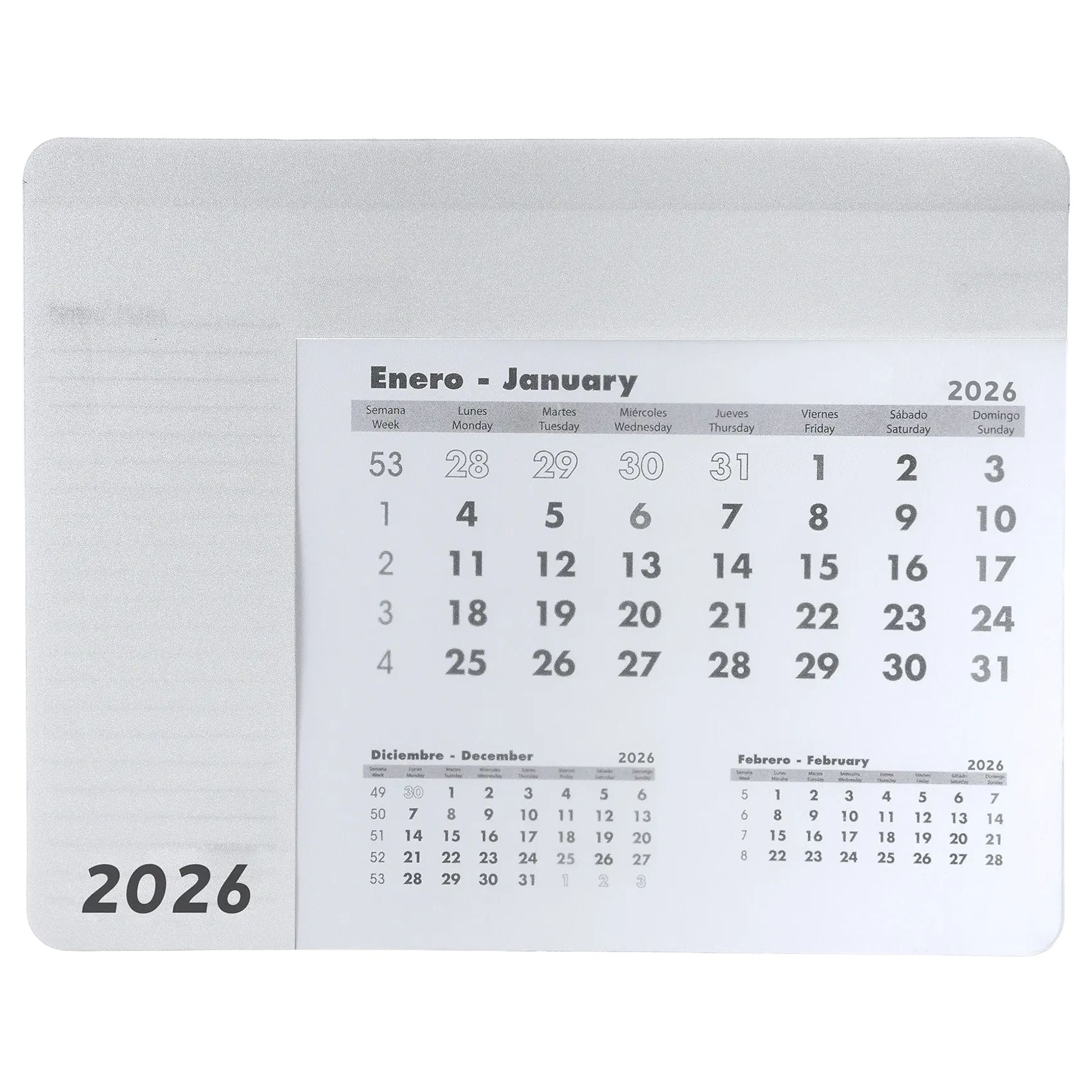 Il tappetino per mouse con calendario Serbal consente di consultare un calendario sotto una copertura trasparente sollevabile, con 12 fogli staccabili in spagnolo e inglese. Base antiscivolo nera per un utilizzo stabile in ufficio.