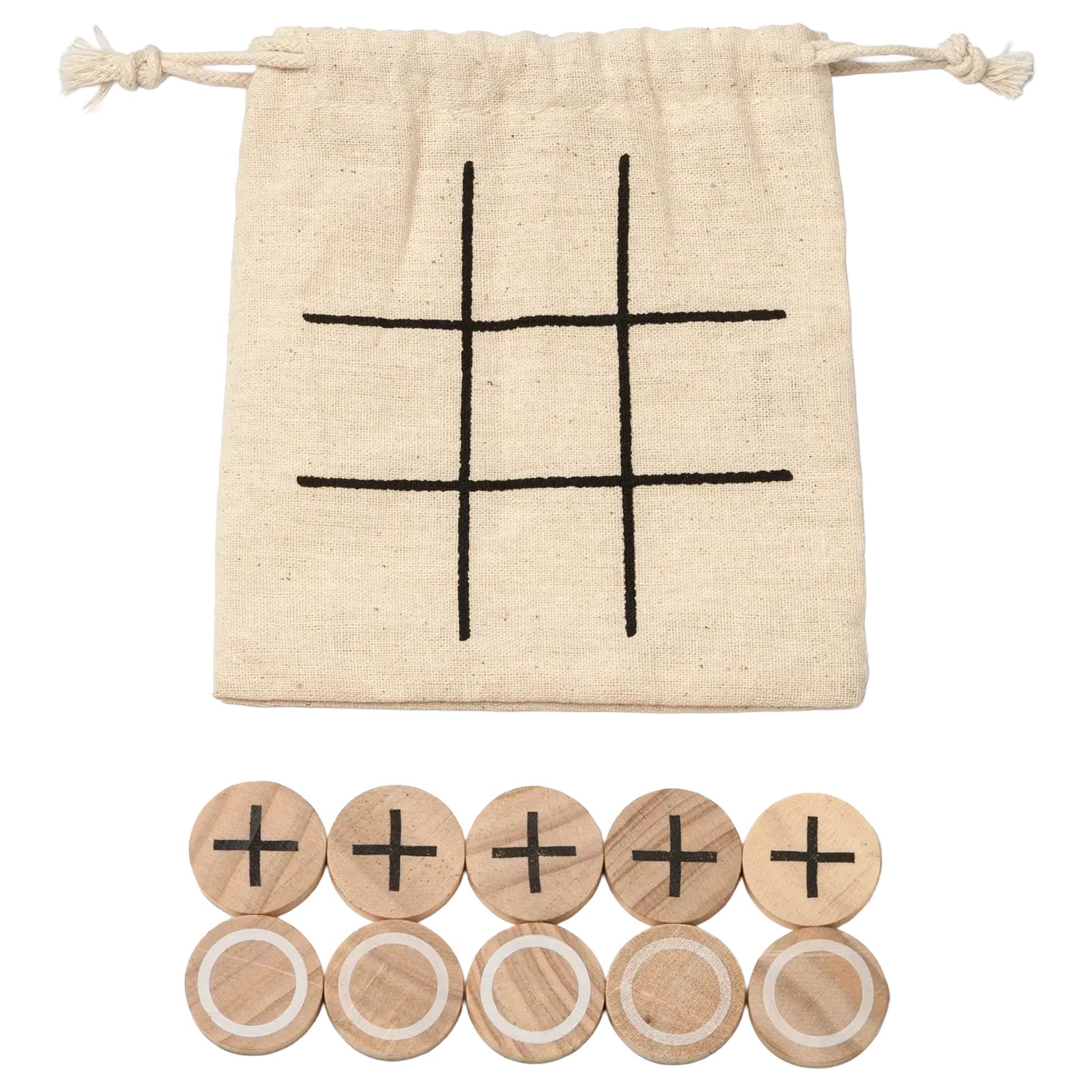 The wooden tic-tac-toe game includes 10 pieces presented in a natural cotton pouch. It stands out for its compact dimensions which facilitate storage and transport.