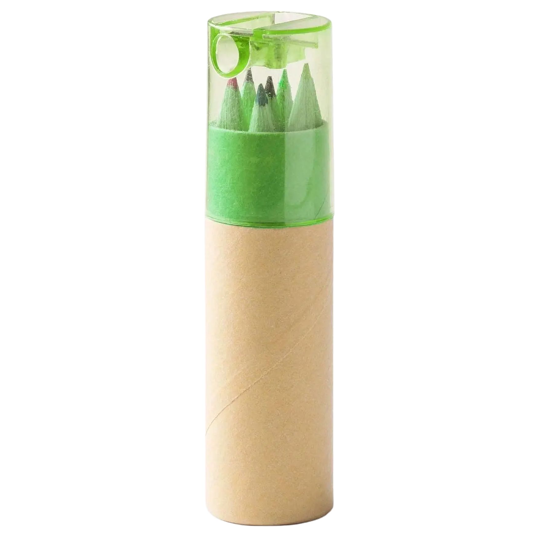 Il set comprende 6 matite in legno in un astuccio di cartone riciclato con cappuccio traslucido colorato. Ogni matita è dotata di un temperino integrato nel cappuccio. Disponibili diversi colori.