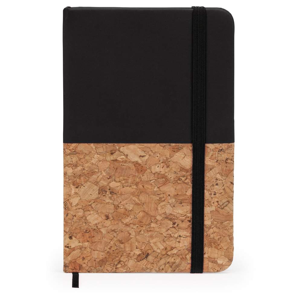 Bloc-notes A6 rigido con una copertina che combina sughero e simile pelle per un aspetto elegante e durevole. Questo blocco notes è dotato di segnalibro e elastico di chiusura per un uso pratico quotidiano. Contiene 80 fogli di carta di qualità, ideali per prendere appunti, scrivere idee o disegnare. Le sue dimensioni compatte (9,3 x 14,3 x 1,5 cm) lo rendono un accessorio facile da trasportare. Questo bloc-notes può essere personalizzato con il vostro logo, un messaggio o un'immagine per un regalo aziendale originale ed efficace.