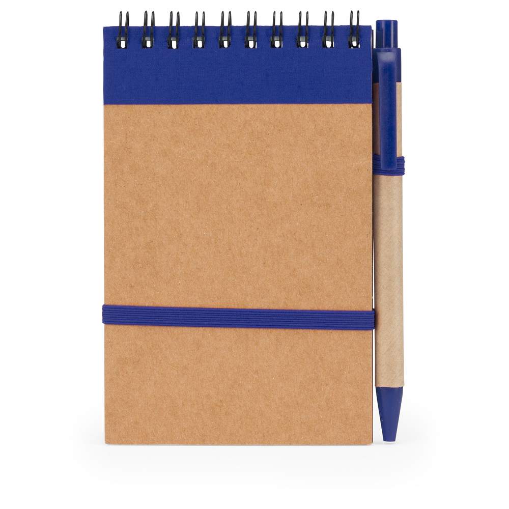 Quaderno a spirale e copertina rigida in cartone riciclato. Fornito con una penna abbinata in inchiostro blu. Questo quaderno contiene 70 fogli. Le sue dimensioni sono di 9,7x14,4x1 cm.