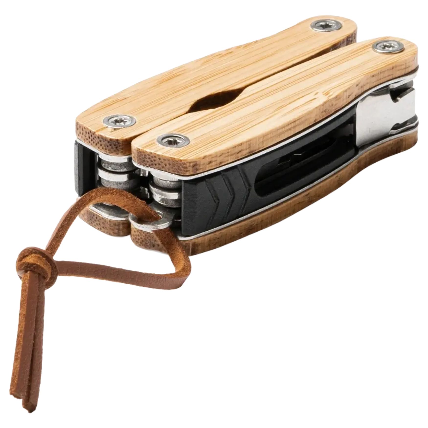 Il MURDOK è un multi-strumento che combina un corpo in acciaio inox e un manico in bambù. Include 12 funzioni: rasoio, sega, lime, apribottiglie, cacciaviti, pinze e nastro adesivo per il trasporto.