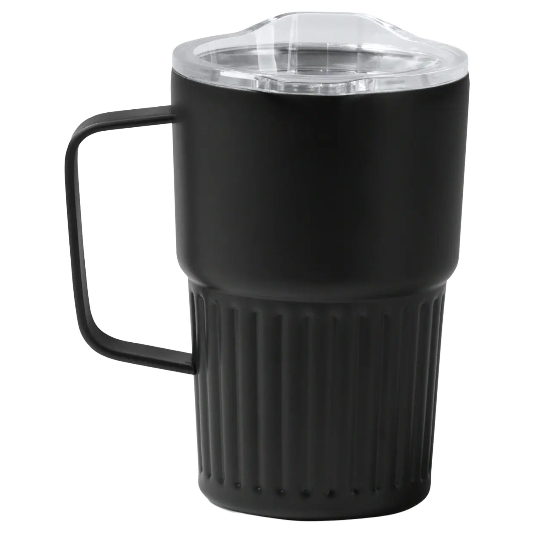 Bicchiere termico NUBEX st-va1794 in acciaio inox 304 riciclato, a doppia parete e forma svasata, con coperchio di sicurezza trasparente. Capacità 450 ml.