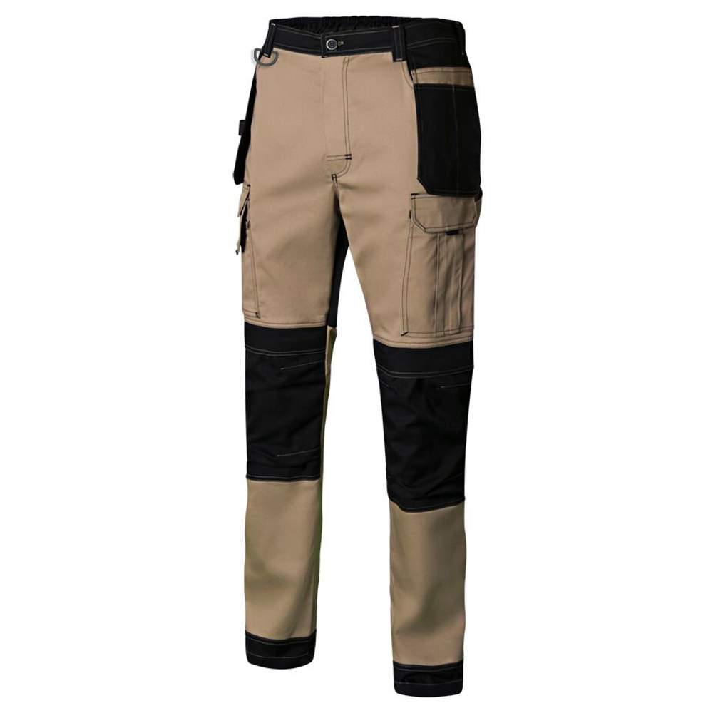 Pantalone da lavoro bicolore in canvas stretch, progettato per offrire comfort e resistenza durante l'uso professionale. È dotato di una chiusura a bottone con zip e una cintura elastica per un adattamento ottimale. Rinforzi in tessuto oxford sono presenti sulle ginocchia e sul fondo del pantalone per una durabilità maggiore. Un rinforzo in tessuto è inoltre integrato nella parte posteriore del pantalone. È dotato di tasche per ginocchiere, con chiusura a velcro. Le cuciture doppie di sicurezza rafforzano la costruzione del pantalone. Pinze alle ginocchia offrono una migliore libertà di movimento. Un anello di plastica è fissato a uno dei passanti della cintura per facilitare l'attacco di accessori. Il pantalone dispone di passanti per cintura. È dotato di tasche flottanti con vari scomparti per un organizzato ripostiglio. Offre un totale di 10 tasche.