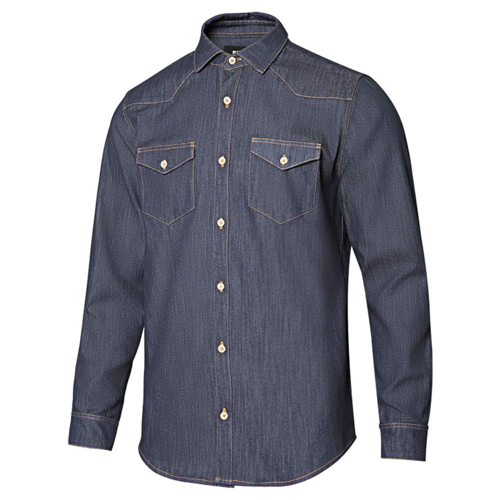 Camicia uomo, realizzata in denim stretch per un comfort ottimale. Presenta una chiusura a bottoni con risvolto, un colletto italiano classico e inserti sul davanti e dietro per una migliore tenuta. I polsini sono abbottonati con due posizioni possibili e un bottone di ricambio è incluso. È dotata di due tasche sul petto con risvolto e bottone. Il tessuto stretch garantisce libertà di movimento.