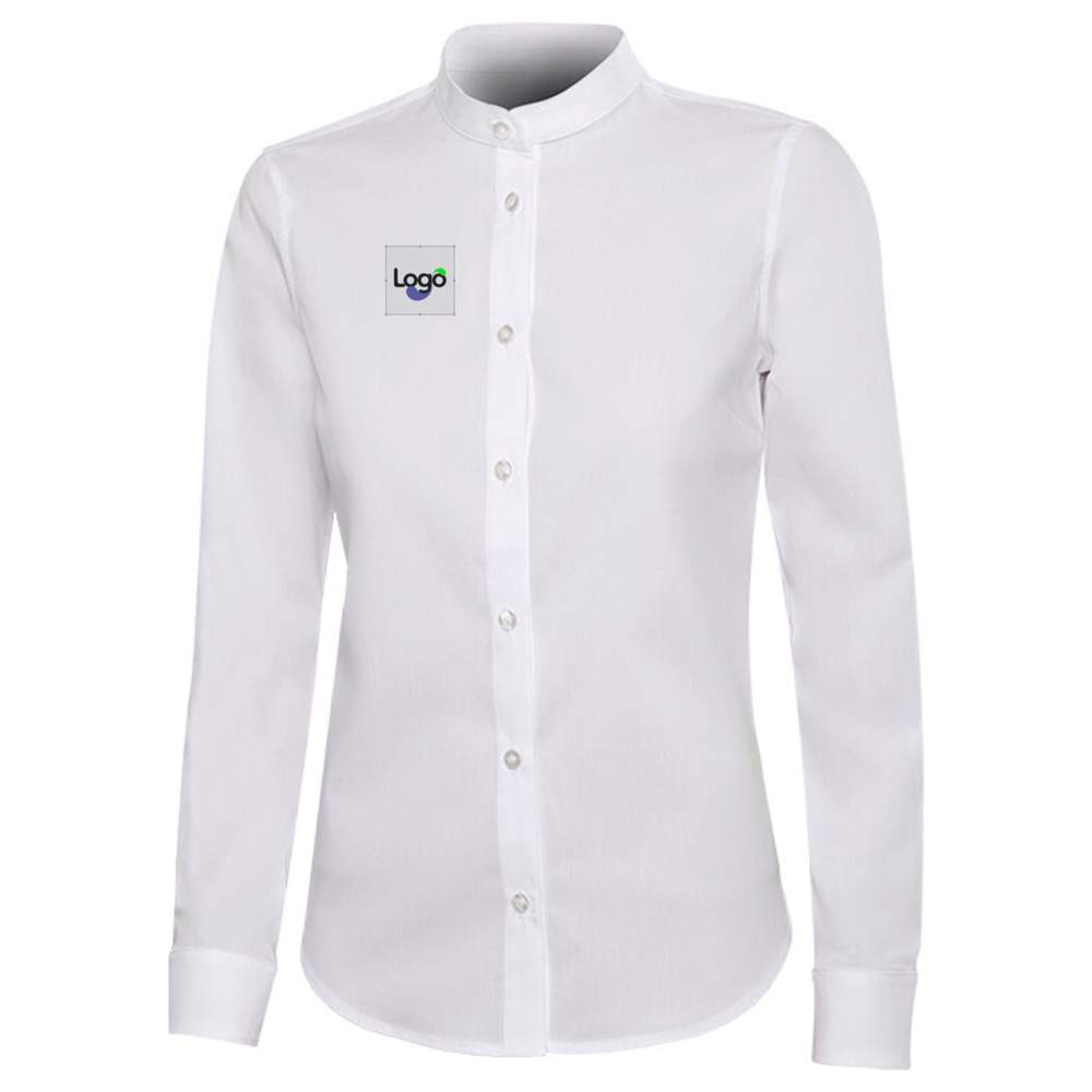 Camicia donna in cotone col mao. Chiusura a bottoni con risvolto. Taglio stretto con pinces davanti e dietro. Pezzo a incastro sulla schiena. Polsini a bottoni. Bottone di ricambio incluso. Possibilità di personalizzazione in ricamo per un look unico e professionale.