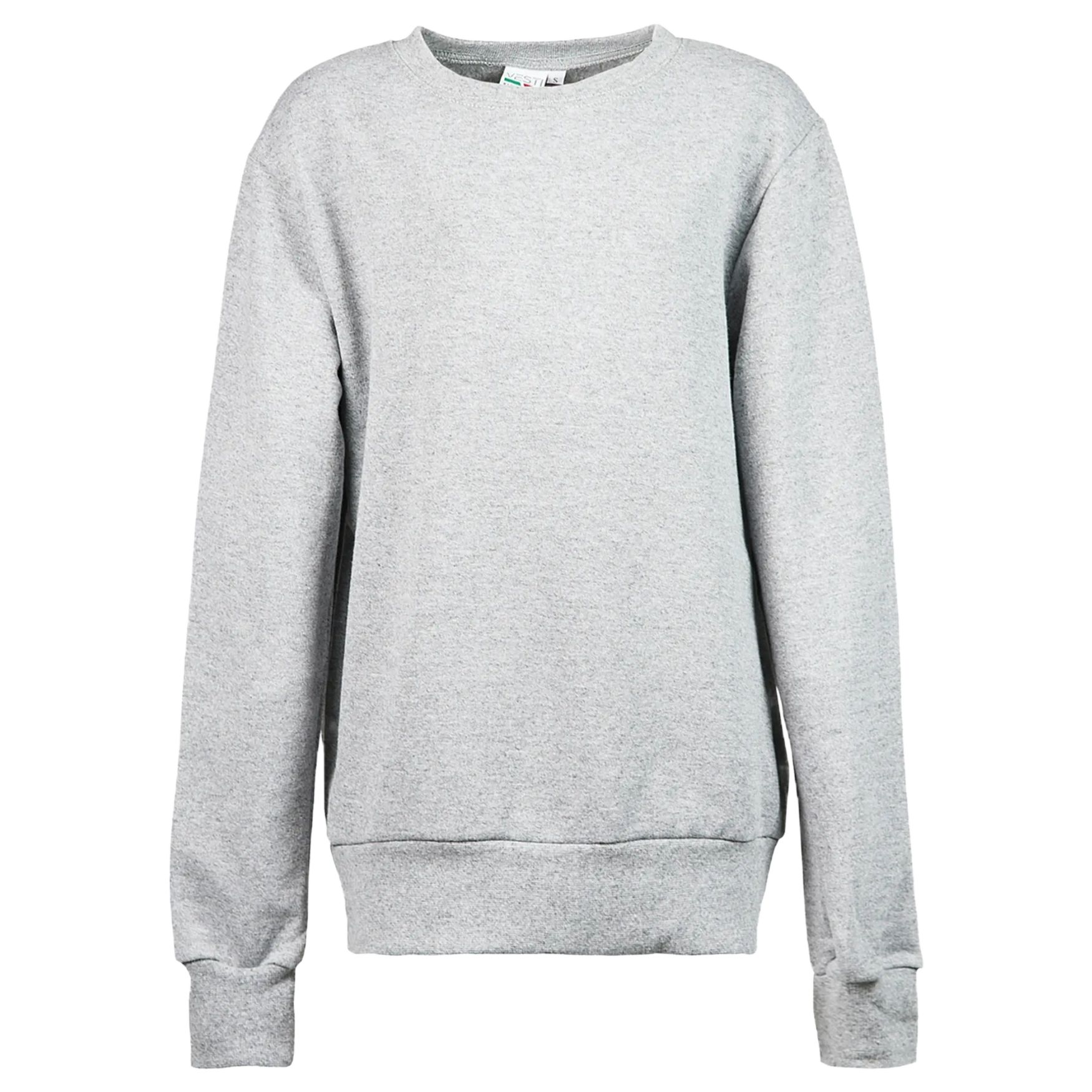 La felpa bambino girocollo è composta da 70% cotone e 30% poliestere con interno spazzolato. Presenta cuciture laterali e maniche dritte per una struttura classica.