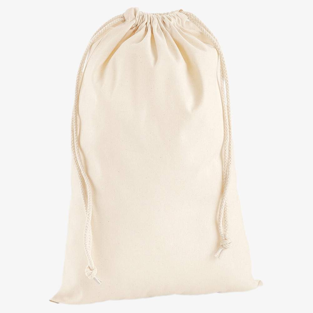 Sacchetto di cotone di qualità progettato per maggiore resistenza. Superficie adatta per una stampa di qualità. Chiusura a doppio cordino per un uso facile.