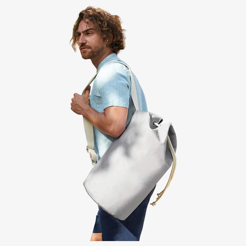 Borsa da marina realizzata in tela di cotone biologico di qualità. Questa borsa offre una capacità di 20 litri e si chiude con un cordino di serratura. È dotata di una tracolla regolabile per un trasporto confortevole. Le sue dimensioni sono di 25 x 53 x 25 cm, il che la rende pratica per trasportare vari articoli. Questa borsa è progettata per un uso quotidiano o per attività all'aperto.