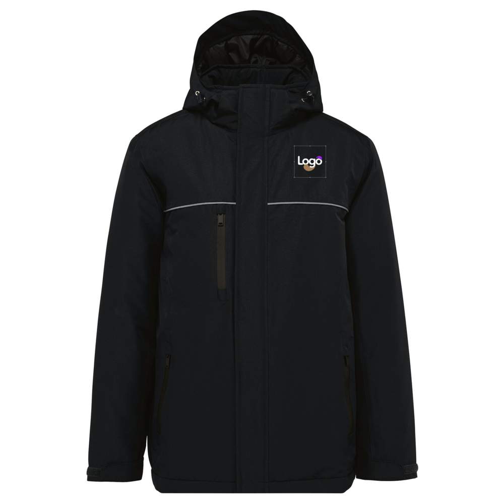 Giacca impermeabile con cappuccio unisex. Davanti: 2 tasche laterali e 1 tasca petto con chiusura zip in nylon impermeabili. 1 tasca interna con chiusura a velcro. Chiusura zip con coprizip e velcro. Passepoil contrastante altezza petto. Cappuccio imbottito e rimovibile a 3 pannelli con zip regolabile con fermagli e velcro. Polsino regolabile con velcro. Fodera in 2 parti: parte superiore in pile, parte inferiore imbottita. Fondello regolabile con fermagli. Zip invisibili per la personalizzazione: 1 lato cuore e 1 fondo. Corda di aggancio interna colletto. Etichetta del marchio Tear Away. Composizione: 100% poliestere. Esterno: 100% poliestere ripstop. Tessuto a 2 strati respirante e impermeabile. Conforme alla norma EN343:2019, Classe 3 (abbigliamento di protezione contro la pioggia). Fodera 100% poliestere. Rivestimento interno 100% poliestere