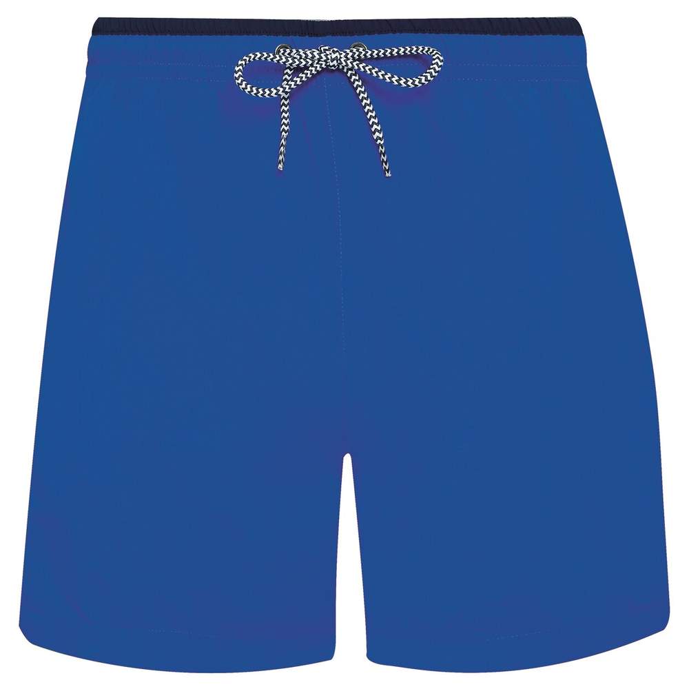 Mannenbadembroek. Contrastkleurige riem op bepaalde kleuren, instelbare taille, gestreepte strikriem, elastische riem en binnenste gaas. Twee zijzakken met binnenste gaas en een achterzak met kliksluiting. Dit product heeft geen merketiket aan de hals.
