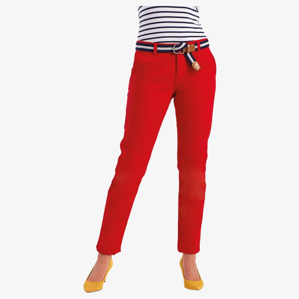 Broek chino van klassieke snit voor vrouwen, ontworpen in een zacht weefsel voor optimaal comfort. Het heeft een ritshemd met een knoopsluiting op het niveau van de taille, evenals riemlussen voor een gemakkelijke bevestiging. Twee zijzakken en twee niet-functionele passepoilzakken achteraan completeren dit model.