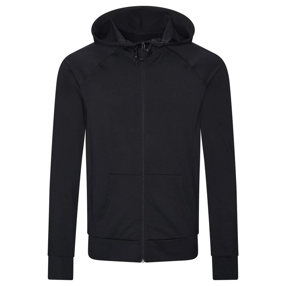 Wanneer de nachten kouder worden of wanneer u een kledingstuk wilt aantrekken om naar de fitnesszaal te gaan, combineert de Cool Sports gezipte hoodie vochtafvoerende eigenschappen met een licht geribbeld weefsel op het lichaam. De aanpasbare kordelkap biedt bescherming tegen de elementen, terwijl de raglan mouwen en duimgaten u een grote beweeglijkheid bieden. Contrasterende stof voor de mouwen en het lichaam.