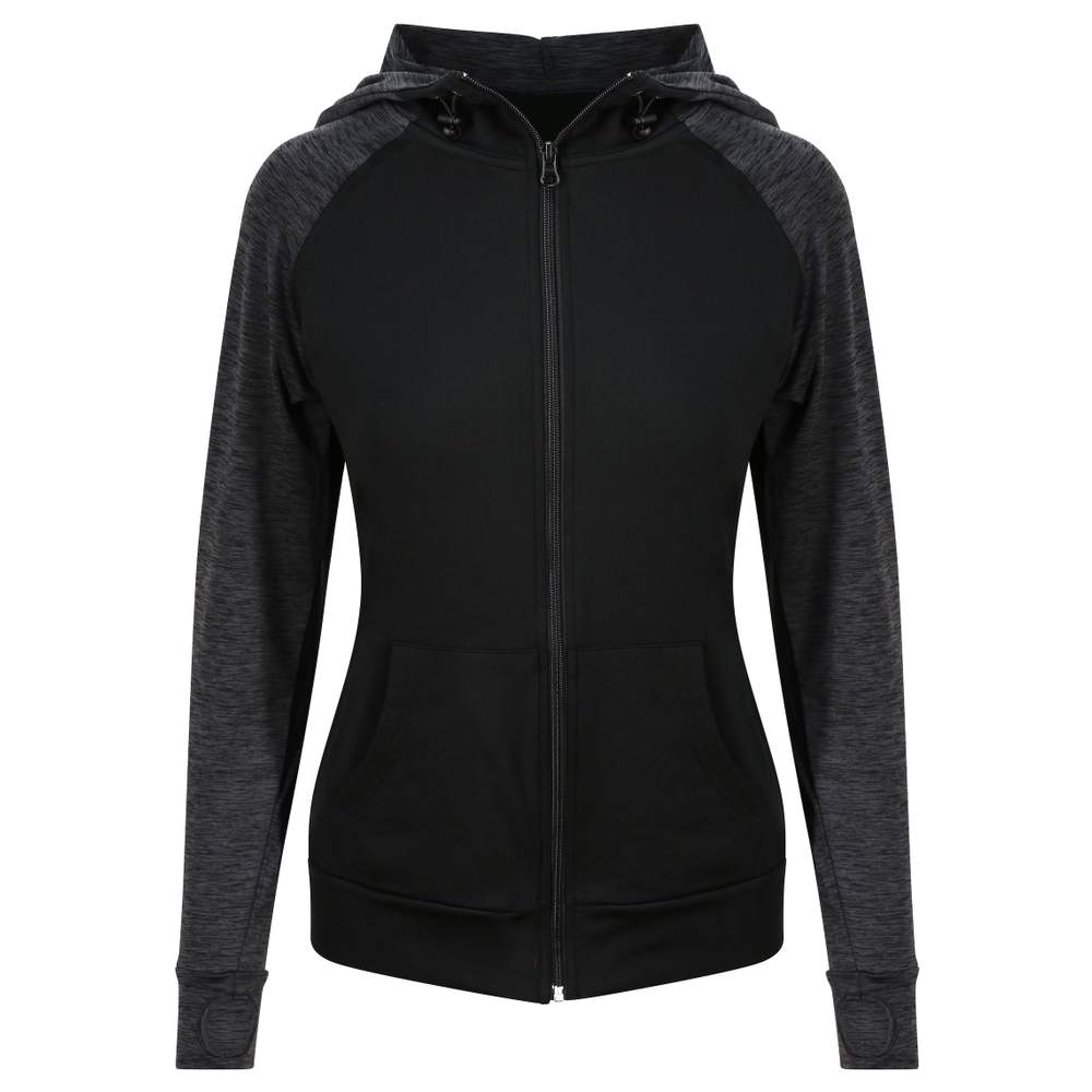 Wanneer de nachten koel worden of als u een warme hoodie wilt aantrekken voor uw reis naar de fitnessruimte, biedt deze gezipte hoodie voor dames een vochtuitstootende eigenschap en een licht geruwd weefsel op het lichaam. De kap met een aanpasbare touwtrek beschermt u tegen de elementen, terwijl de raglanmouwen en duimgaatjes u grote beweeglijkheid bieden. Contrasterend weefsel voor de mouwen en het lichaam.