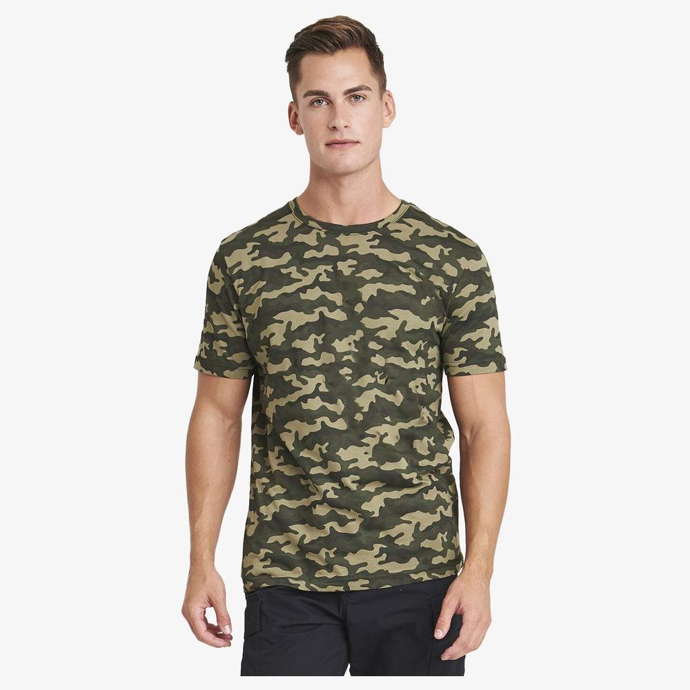 Korte mouwen T-shirt voor mannen, biedt een moderne pasvorm. Het bedrukte camouflageweefsel biedt een onderscheidend uiterlijk. De monté mouwen en de gestreepte ronde hals dragen bij aan een optimale comfort. De zijnaden en de dubbele overlock naad aan de mouwen en de onderkant versterken de duurzaamheid van het kledingstuk. Dit T-shirt is gemaakt van katoen, biedt een zachte en aangename aanraking. De productie is gecertificeerd WRAP, wat getuigt van verantwoorde praktijken.