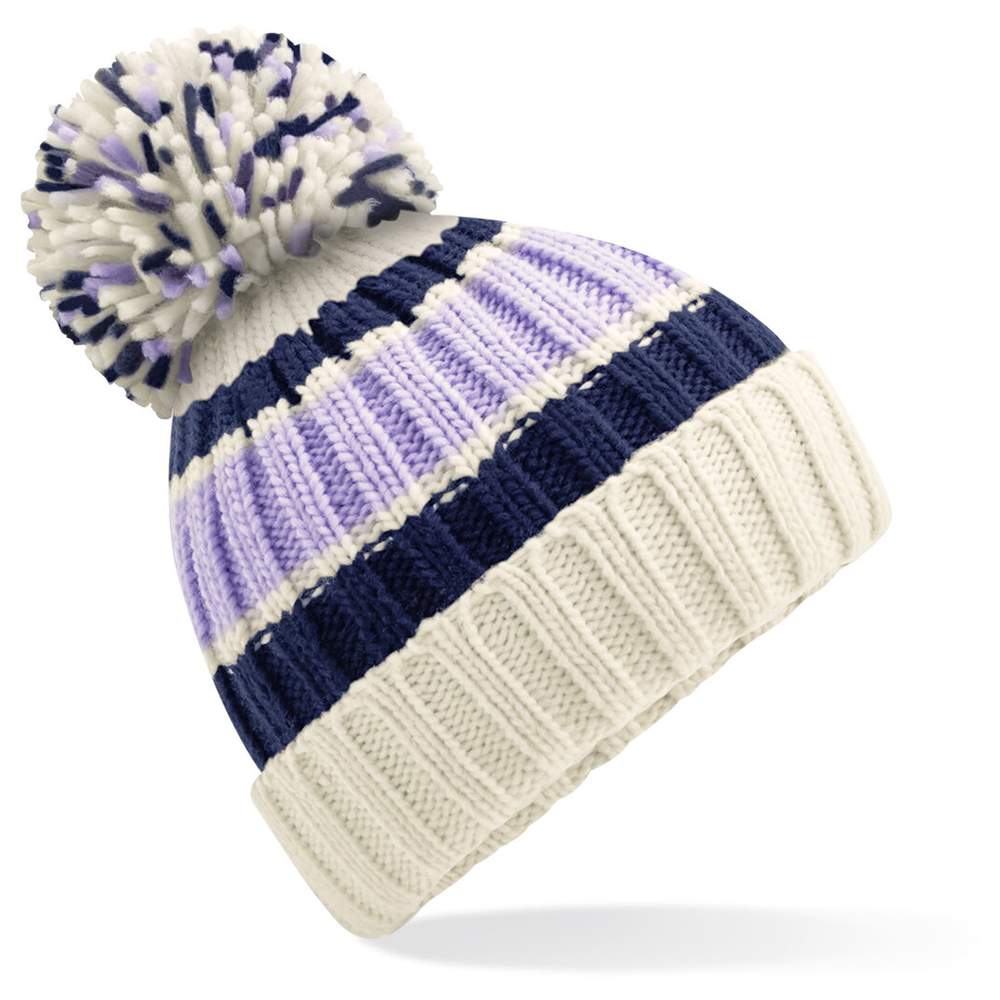 Muts met dikke ribbelsteek, met levendige drieling strepen en een luxe overdimensionale pompon. De vachtimitatie voering biedt extra warmte. Ontwerp met revers voor een comfortabele pasvorm. Eenmaalige maat. Verwijderbare label