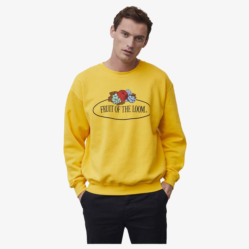 Sweat met een groot gedrukt Fruit of the Loom logo op de voorzijde. Dit model heeft een rib hals zonder naden, een schouderband van schouder tot schouder en ribben aan de polsen en onderkant. De mouwopeningen en de hals zijn gemaakt met een dubbele naad. Deze sweat is gemaakt van katoen en polyester in buisconstructie.
